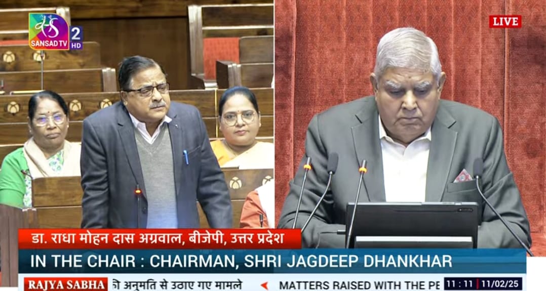 भाजपा सदस्य डॉ. राधा मोहन दास अग्रवाल ने संविधान की मूल प्रति पर इलस्ट्रेशन होने का उल्लेख करते हुए कहा कि जो प्रतियां छप रही हैं और प्रसारित हो रही हैं, उन पर ये इलस्ट्रेशन नहीं छप रहे हैं। उन्होंने मोहन जोदड़ो की सभ्यता से लेकर भगवान राम के अयोध्या लौटने, कुरुक्षेत्र में अर्जुन को उपदेश देते भगवान श्रीकृष्ण से लेकर भगवान बुद्ध तक की तस्वीरें छप रहे संविधान पर नहीं होने का मुद्दा उठाया। इस पर सभापति धनखड़ ने कहा कि भारत के संविधान, जो हस्ताक्षरित है, वही हमारा संविधान है। जिस प्रति पर संविधान के निर्माताओं ने दस्तखत किए हैं, उसका अभिन्न अंग है। 22 कृतियां जो भारत की सांस्कृतिक यात्रा के 5000 साल दर्शाती हैं।