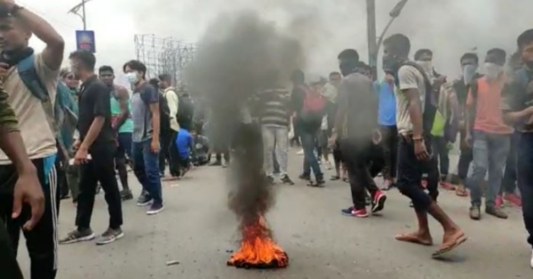 सिलीगुड़ी- 17 जून। केंद्र सरकार की अग्निपथ योजना का विरोध अब उत्तर बंगाल में भी दिखना शुरू हो गया है। शुक्रवार को सिलीगुड़ी में अग्निपथ योजना को लेकर युवाओं ने जमकर प्रदर्शन किया। इस दौरान प्रदर्शनकारियों ने फ्लाईओवर पर टायर जलाकर विरोध जताया है। दूसरी ओर युवाओं का एक जत्था एनजेपी स्टेशन इलाके में पहुंच गया है। जहां जमकर हंगामा किया जा रहा है। खबर लिखे जाने तक स्थिति सामान्य है। शहर के मूल रास्तों के अलावा हाशमी चौक में भी युवाओं को प्रदर्शन करते देखा गया।