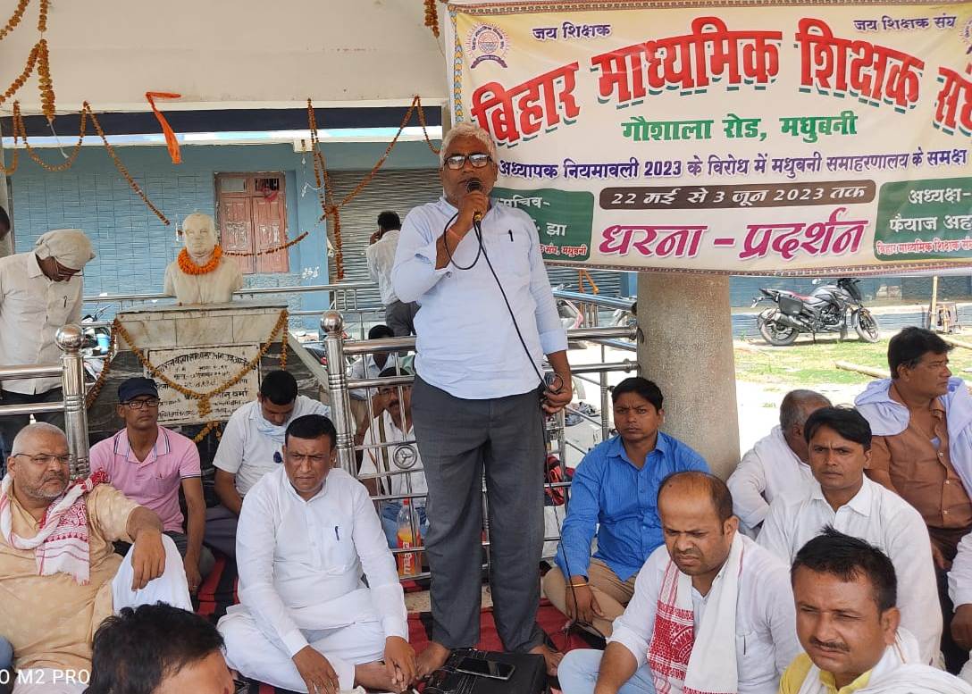 मधुबनी- 22 मई। अध्यापक नियुक्त नियमावली 2023 के विरोध में समाहरणालय के समक्ष बिहार माध्यमिक शिक्षक संघ के तत्वधान में षिक्षकों ने सत्याग्रह आंदोलन जिला अध्यक्ष के अध्यक्षता में सोमवार से शुरू किया। सत्याग्रह आंदोलन कार्यक्रम 22 मई से 03 जुन तक चलेगा। सत्याग्रह आंदोलन को सम्बोधित करते हुए बिहार माध्यमिक शिक्षक संघ के जिला सचिव शम्भु कुमार झा ने कहा कि यह नियमावली शिक्षकों के हित में नहीं है। सरकार हमे बिना शर्त राज्य कर्मी का दर्जा दे। सरकार का यह तानाशाही रवैया से विद्यालय के पठन पाठन पर प्रतिकूल असर पड़ा है। उन्होने कहा कि नियमावली के वापसी और शिक्षकों को बिना शर्त राज्य कर्मी का दर्जा देने तक आन्दोलन जारी रहेगा।