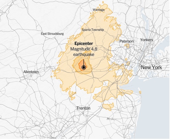 यूनाइटेड स्टेट्स जियोलॉजिकल सर्वे (यूएसजीएस) ने शुक्रवार सुबह 10:23 बजे आए इस भूकंप की तीव्रता रिक्टर स्केल पर चार दशमलव आठ (4.8) बताई है। यूएसजीएस के अनुसार, पूर्वोत्तर संयुक्त राज्य अमेरिका में इसके झटके फिलाडेल्फिया से बोस्टन तक महसूस किए गए। मैनहट्टन और पांच नगरों में तेज झटकों से इमारतें हिलने लगीं। को झटका लगा। यूएसजीएस के विवरण के अनुसार, भूकंप का केंद्र न्यूयॉर्क शहर से लगभग 40 मील पश्चिम में व्हाइट हाउस स्टेशन, न्यूजर्सी के पास था।