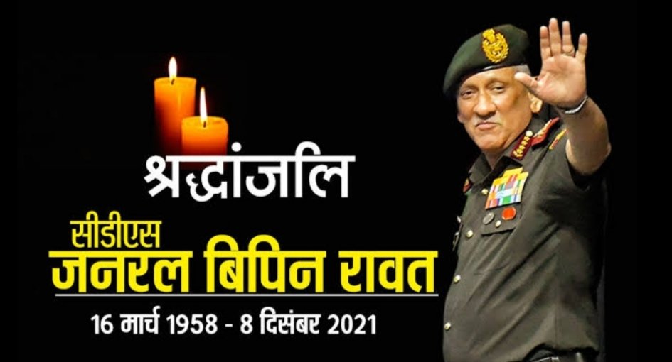 नई दिल्ली-09 दिसम्बर। तमिलनाडु के कुन्नूर में बुधवार को दुर्घटनाग्रस्त हुए वायु सेना के हेलीकॉप्टर में भारत के पहले चीफ ऑफ डिफेंस स्टाफ (सीडीएस) जनरल बिपिन रावत, उनकी पत्नी मधुलिका रावत समेत 13 लोगों की मौत होने की पुष्टि वायुसेना ने कर दी है। जनरल सेना में रहने के दौरान अपनी पूरी जिन्दगी ऐसे रोल माडल की तरह जिये, जिसे हर सैनिक अपनाना चाहेगा। जनरल रावत 2016 में पाकिस्तान के आतंकी अड्डों को नष्ट करने के लिए हुई सर्जिकल स्ट्राइक के भी हीरो रहे हैं। सेना के तेज तर्रार अफसरों में शामिल चीफ आफ डिफेंस स्टाफ बिपिन रावत के आक्रामक बयानों से चीन और पाकिस्तान खौफ खाते रहे हैं।