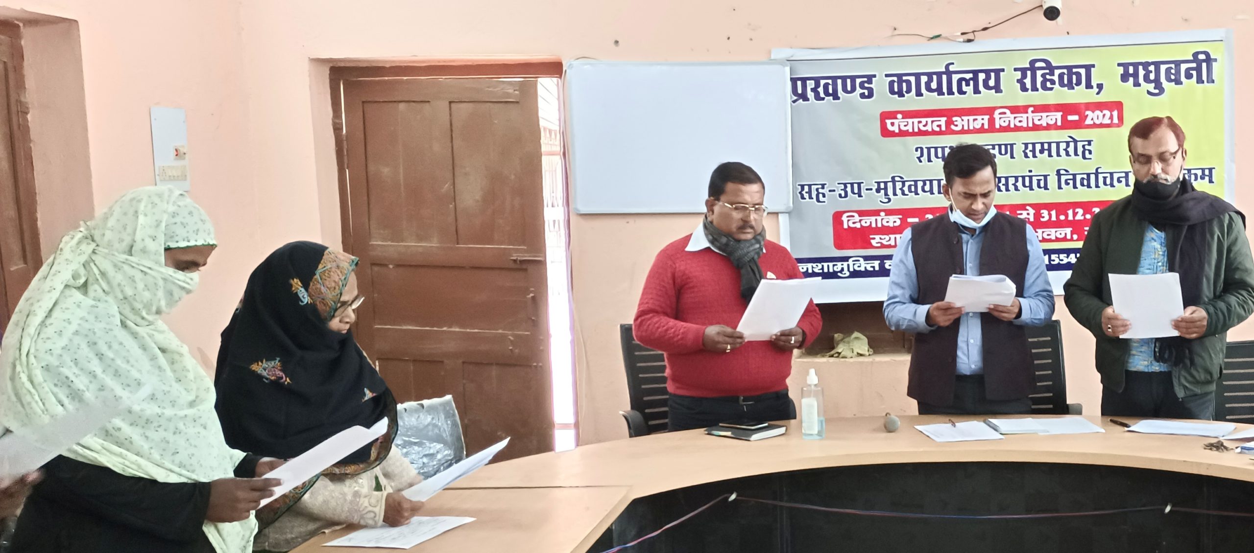 मधुबनी-27 दिसंबर। रहिका प्रखंड मुख्यालय स्थित टीपीसी भवन में नवनिर्वाचित पंचायत प्रतिनिधियों का शपथ ग्रहण कार्यक्रम जारी है। सोमवार को इजरा पंचायत की नवनिर्वाचित मुखिया जाहिदा खातुन एवं सभी 15 वार्ड सदस्यों को प्रखंड निर्वाचन पदाधिकारी सह बीडीओ सतेंद्र कुमार एवं जिला से नियुक्त मजिस्ट्रेट ने शपथ दिलायी।