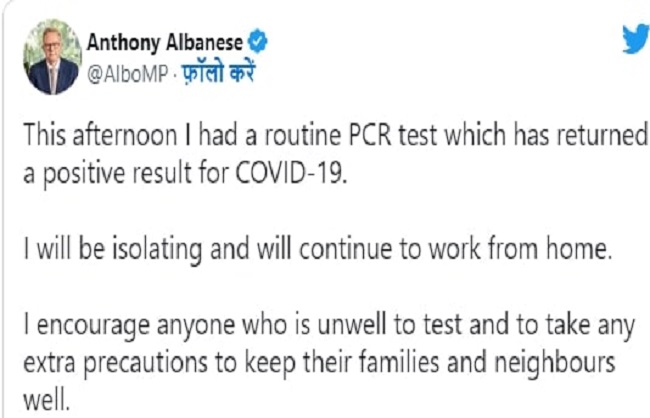एंथनी अल्बनीस ने सोमवार को ट्वीट किया कि आज दोपहर उनका नियमित पीसीआर परीक्षण हुआ। इस परीक्षण में उनका कोरोना के लिए सकारात्मक परिणाम आया है। कोरोना पॉजिटिव आने के बाद उन्होंने स्वयं को सबसे अलग कर लिया है। उन्होंने ट्वीट में लिखा कि वह खुद को सबसे अलग रखेंगे और कोरोना के नियमों का पालन करेंगे। उन्होंने कहा कि वे सबसे अलग रह रहे हैं और घर से काम करना जारी रखेंगे। अपने ट्वीट में उन्होंने अन्य लोगों से भी सावधानी बरतने की अपील की। उन्होंने कहा कि कोई भी व्यक्ति यदि अस्वस्थ है, तो तुरंत परीक्षण कराए और अतिरिक्त सावधानी बरते। ऐसा करना पड़ोसियों व परिजनों को स्वस्थ रखने के लिए भी जरूरी है।