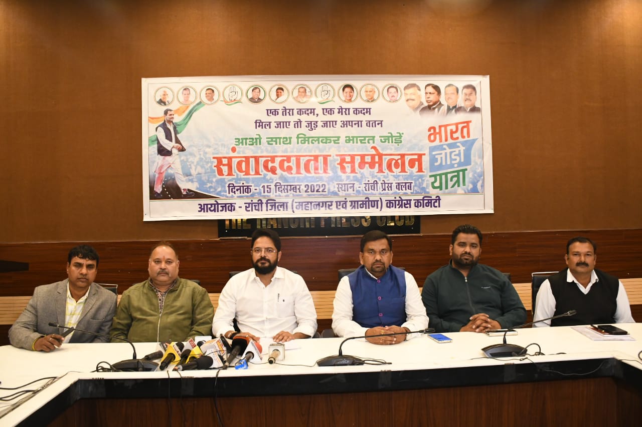 रांची- 15 दिसम्बर। रांची में भारत जोड़ो यात्रा 17 दिसम्बर को रांची के जिला स्कूल शहीद स्मारक में शहीदों को नमन करने के बाद निकाली जायेगी। रांची जिला महानगर कांग्रेस कमिटी के अध्यक्ष डॉ कुमार राजा ने गुरुवार को प्रेस कांफ्रेंस में यह जानकारी दी। राजा ने बताया कि यात्रा फिरायालाल चौक में शहीद अल्बर्ट एक्का की प्रतिमा में माल्यार्पण करते हुए ओल्डएचबीरोड, लालपुर होते हुए बिरसा मुंडा की समाधि स्थल कोकर तक जाएगी।