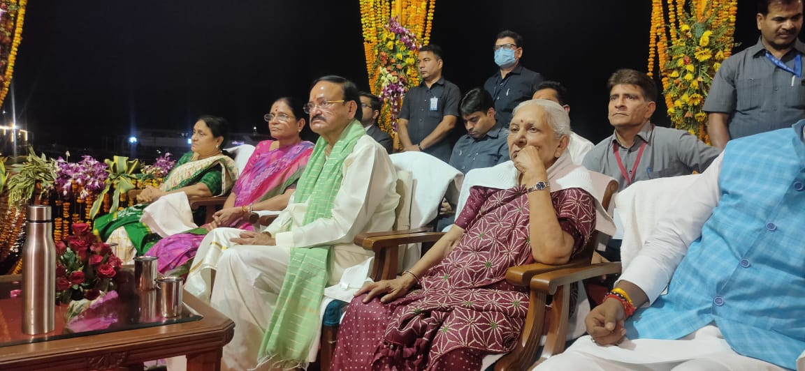 वाराणसी- 15 अप्रैल। उपराष्ट्रपति एम. वेंकैया नायडू शुक्रवार शाम दशाश्वमेध घाट पर काशी की विश्व प्रसिद्ध गंगा आरती देख आह्लादित नजर आये। धर्मपत्नी एम उषा नायडू के साथ गंगा आरती में शामिल हुए उपराष्ट्रपति ने प्रदेश की राज्यपाल आनंदी बेन पटेल, उप मुख्यमंत्री बृजेश पाठक के साथ विधि विधान से पूजा अर्चना कर मां गंगा का दुग्धाभिषेक भी किया। उपराष्ट्रपति गंगा सेवा निधि की विशेष महाआरती, लयबद्ध गायन के बीच परम्परागत वेशभूषा में अर्चकों को आरती करते ध्यान से देखते रहे।
