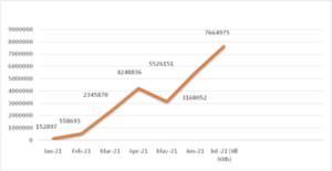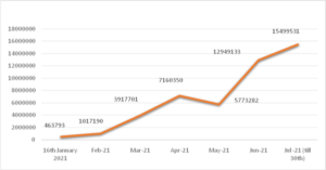 अपने बड़े आकार और बड़ी संख्या में ग्रामीण आबादी के बावजूद राज्य अपने सभी पात्र नागरिकों को जल्द से जल्द मुफ्त टीकाकरण प्रदान करने के लिए प्रतिबद्ध है। राज्य ने इस दिशा में सक्रिय रूप से काम किया है और जो हर माह राज्य के बढ़ रही टीकाकरण के कवरेज से दिखाई भी दे रहा है। राज्य के अपनी मासिक वैक्सीन कवरेज में लगातार सुधार हो रहा है, जो जनवरी में हुए केवल 4.63 लाख टीकाकरण से बढ़कर जुलाई के महीने में 1.54 करोड़ से अधिक हो गया है। टीकाकरण कवरेज के मामले में भी उत्तर प्रदेश अग्रणी राज्यों में बना हुआ है।