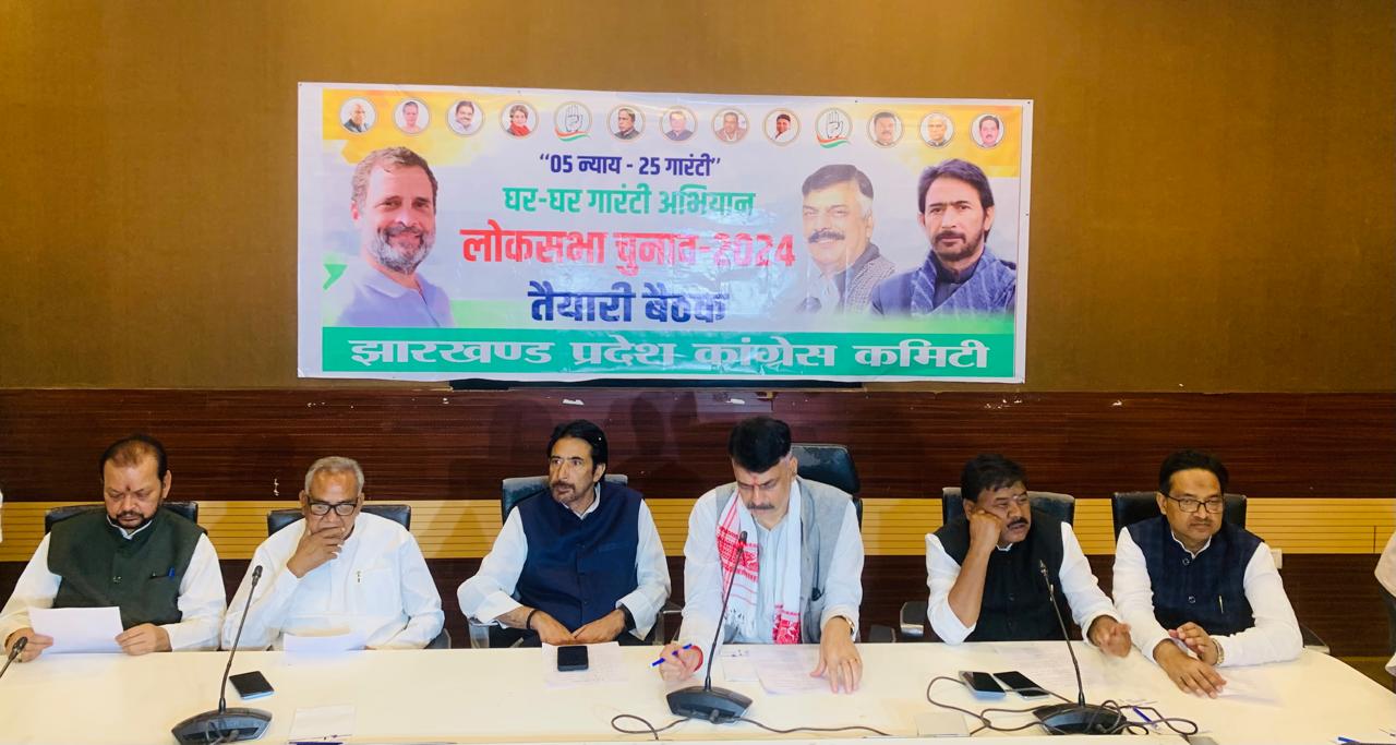 रांची- 06 अप्रैल। प्रदेश कांग्रेस अध्यक्ष राजेश ठाकुर की अध्यक्षता में शनिवार को सभी लोकसभा क्षेत्र के प्रभारी, लोकसभा उम्मीदवार, जिला अध्यक्ष, जिला प्रभारी,प्रवक्ता की बैठक प्रेस क्लब सभागार में हुई। बैठक के मुख्य अतिथि प्रदेश प्रभारी गुलाम अहमद मीर ने कहा कि आने वाले चुनाव में हमारी पहली लड़ाई संविधान बचाने के लिए है, तो दूसरी लड़ाई लोगों के स्वतंत्रता के अधिकार को बचाने के लिए है। लोग इस देश में अपनी मर्जी से कैसे रहे, क्या खाएं, क्या पहने, क्या बोलें इसकी स्वतंत्रता होनी चाहिए।