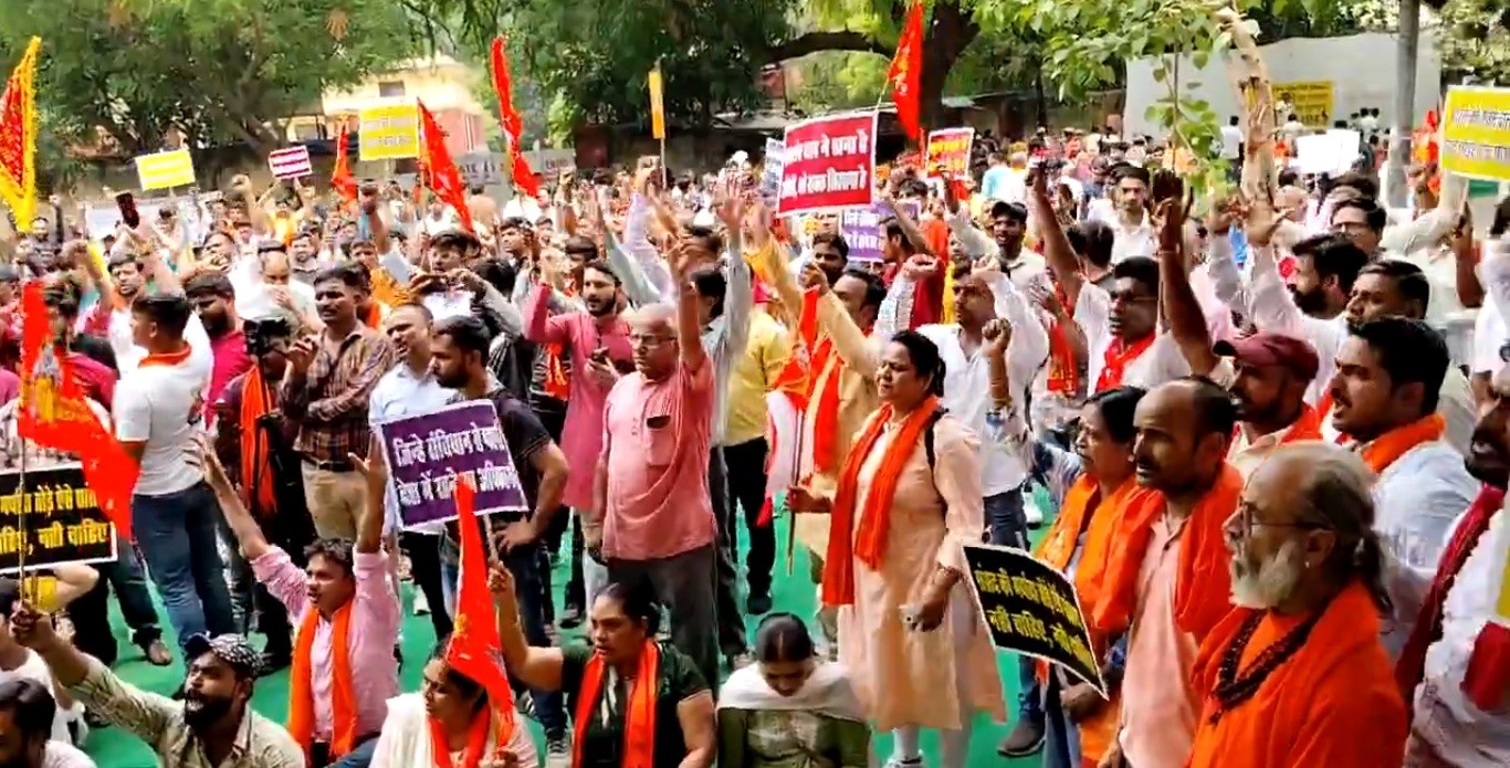 जय फिलिस्तीन पर सांसद ओवैसी के घर के बाहर विश्व हिन्दू परिषद और बजरंग दल का विरोध प्रदर्शन