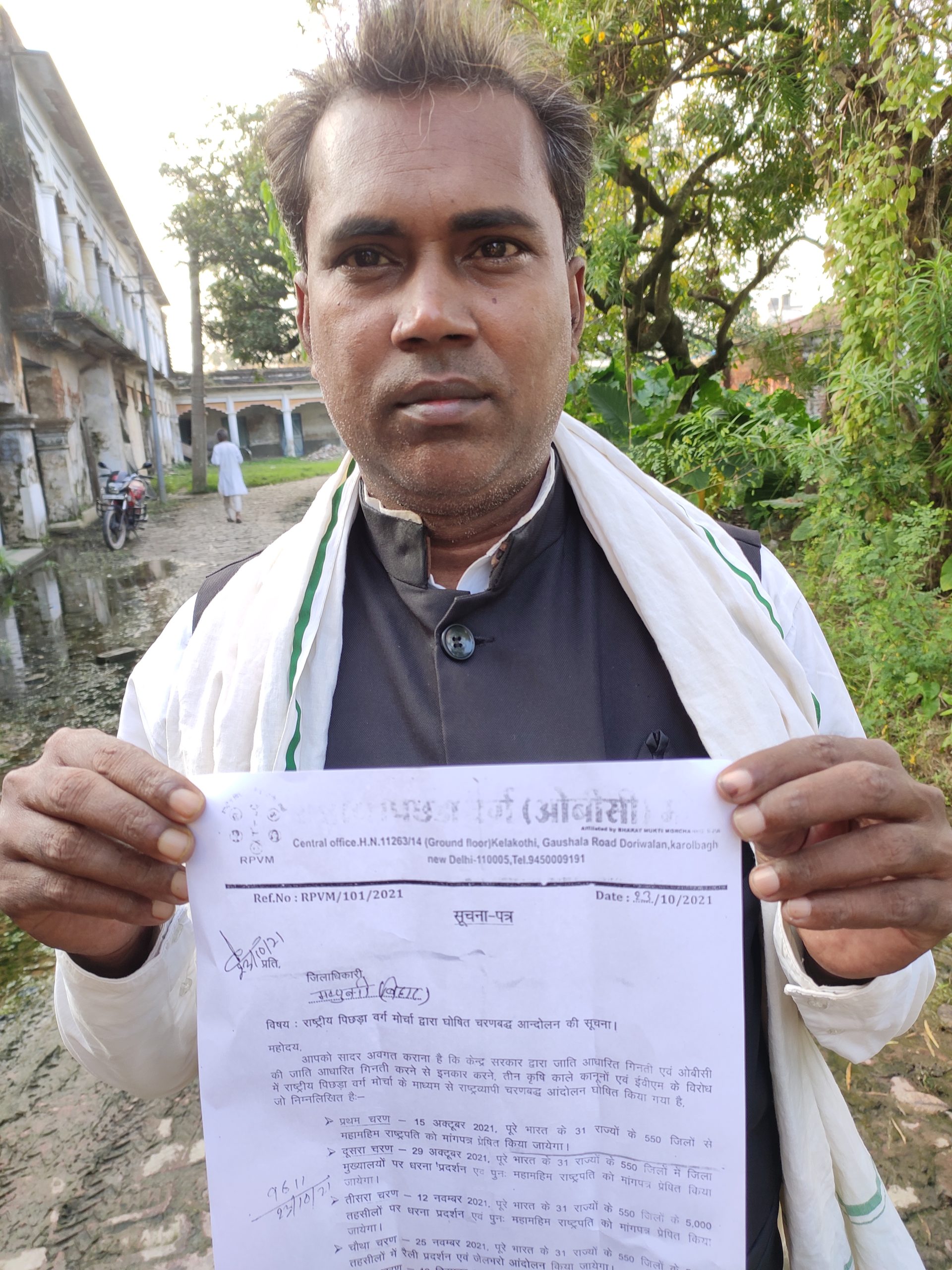 मधुबनी। राष्ट्रीय पिछड़ा वर्ग मोर्चा अपने चलाए जा रहे चरणबद्ध आंदोलन के तहत 29 को जिला मुख्यालय पर धरना व प्रदर्शन का आयोजन करेगा। मोर्चा के जिलाध्यक्ष विजय कुमार ठाकुर ने बताया कि केंद्र सरकार द्वारा जाति आधारित गिनती एवं पिछड़ा वर्ग की जाति आधारित गिनती से इंकार किये जाने,तीन कृषि काले कानून व चुनाव में इवीएम के खिलाफ आन्दोलन चलाया जा रहा है। राष्ट्रव्यापी इस आंदोलन के क्रम में राष्ट्रपति को सामूहिक ज्ञापन भी भेजा गया है। इसक्रम में 12 नवंबर को अनुमंडल पर धरना व प्रदर्शन होगा। 25 नवंबर को रैली,प्रदर्शन व जेल भरो आंदोलन होगा। वहीं 10 दिसंबर को भारत बंद का आह्वान किया गया है। उन्होंने बताया कि इस जनआंदोलन के लिए लोगों की अधिकाधिक भागीदारी के लिए उन्हें जागरुक किया जा रहा है।