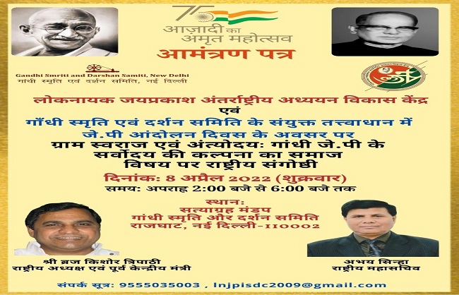 अभय सिन्हा ने एक बयान जारी की बताया कि जयप्रकाश अंतरराष्ट्रीय अध्ययन विकास केंद्र एवं गांधी स्मृति दर्शन समिति के संयुक्त तत्वावधान में आयोजित यह कार्यक्रम गांधी स्मृति एवं दर्शन समिति राजघाट नई दिल्ली परिसर में स्थित सत्याग्रह मंडप सभागार में 8 अप्रैल 2022 को होगा। उन्होंने बताया कि लोकनायक जयप्रकाश अंतरराष्ट्रीय अध्ययन अंतरराष्ट्रीय केंद्र के राष्ट्रीय अध्यक्ष एवं पूर्व केंद्रीय मंत्री ब्रज किशोर त्रिपाठी कार्यक्रम की अध्यक्षता करेंगे, जबकि कार्यक्रम का संचालन इलाहाबाद विश्वविद्यालय की आर्य कन्या डिग्री कॉलेज की सह प्राध्यापिका डा. रंजना त्रिपाठी करेंगी।