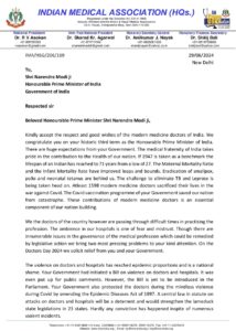 इसके साथ पत्र में राष्ट्रीय चिकित्सक दिवस के मौके पर आईएमए ने देश में चिकित्सकों पर हमले की बढ़ती घटनाओं पर चिंता व्यक्त की है। राष्ट्रीय चिकित्सक दिवस एक जुलाई को मनाया जाता है। आईएमए ने केन्द्र सरकार से मांग की है कि केन्द्र सरकार डॉक्टरों के साथ अस्पतालों में हो रही हिंसा को रोकने के लिए तुरंत कानून लाए।