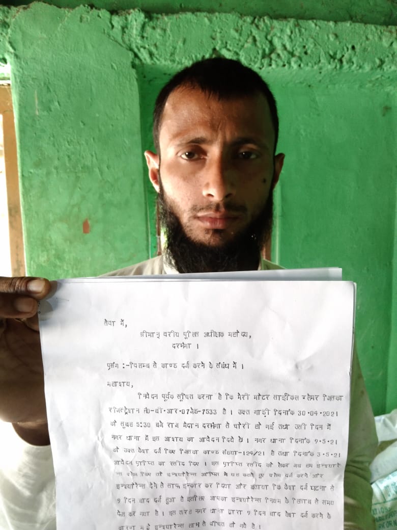 मधुबनी-11 नवंबर। दरभंगा पुलिस की कोताही के कारण मधुबनी जिला के इजरा गांव निवासी मो साकिब इंश्योरेंस की रकम लेने के लिए दर-दर की ठोकर खा रहा है। इस संबंध में इजरा गांव निवासी मो साबिक ने दरभंगा के वरीय पुलिस अधीक्षक को लिखित आवेदन देकर न्याय की गुहार लगायी है। मो साबिक द्वारा वरीय पुलिस अधीक्षक को दिए गए आवेदन में कहा गया है कि मेरी बाईक ग्लेमर संख्या-बीआर-07 जेड-7533 है। उक्त बाईक की चोरी पिछले 30 अप्रील 2021 को दरभंगा नगर थाना क्षेत्र के राज मैदान से चोरी हो गई। जिस संबंध में हमने उसी दिन 30 अप्रील 2021 को नगर थाना को लिखित आवेदन देकर बाईक चोरी की सुचना दी। पंरतू नगर थाना पुलिस ने करीब एक सप्ताह बाद 09 अप्रील 2021 को प्राथमिकी संख्या-124/21 दर्ज किया। तथा मुझे थाना द्वारा आवेदन की प्राप्ति रसीद 03 मई 2021 को दिया गया। जिस प्राप्ति रसीद को लेकर हम जब इंष्योरेंस कार्यालय गए। जिसके बाद इंश्योरेंस कार्यालय द्वारा मुझे यह कह कर वापस कर दिया गया कि चोरी की घटना के दिन ही प्राथमिकी दर्ज होती तो आपको इंश्योरेंस की रकम मिलती। क्योंकि प्राथमिकी 9 दिनों बाद दर्ज किया गया है। ससमय प्राथमिकी दर्ज नही होने से आपको इंष्योरेंस का लाभ नही मिल पाएगा। आखिर में मो साकिब ने दरभंगा के वरीय पुलिस अधीक्षक से गुहार लगाई है कि अपने स्तर से जांच कर मुझे इंश्योरेंस का लाभ दिलाने की कृपा की जाए। अब सवाल उठता है कि पुलिस की कोताही के कारण बाईक चोरी की प्राथमिकी ससमय दर्ज नही की गयी। जिसकारण मो साकिब को इंष्योरेंस का लाभ नही मिल पा रहा है। जिसका दोषी कौन होगा।