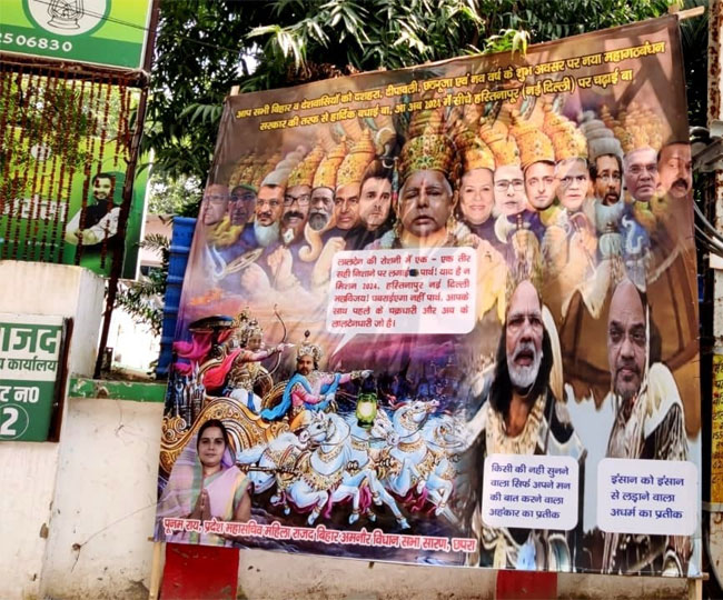 राजद के प्रदेश कार्यालय के बाहर लगे पोस्टर में राजद सुप्रीमो लालू यादव को भगवान विष्णु, बिहार के मुख्यमंत्री नीतीश कुमार को महाभारत का अर्जुन और उप मुख्यमंत्री तेजस्वी यादव को भगवान कृष्ण के रूप में दिखाया गया है। इसके साथ पोस्टर में प्रधानमंत्री नरेन्द्र मोदी और केन्द्रीय गृह मंत्री अमित शाह को भी दिखाया गया, जिन्हें अहंकार का प्रतीक के रूप में बताया गया है।
