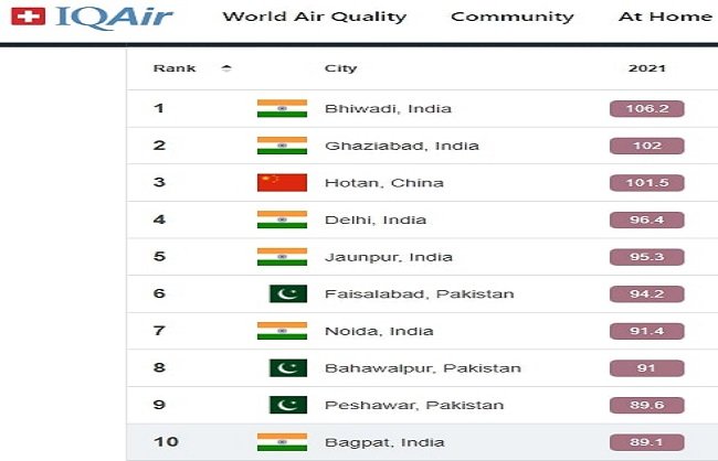 वर्ष 2021 के लिए जारी आईक्यूएयर की रिपोर्ट में राजस्थान का भिवाड़ी शहर दुनिया का सर्वाधिक प्रदूषित शहर है। प्रदूषण के मामले में गाजियाबाद दुनिया में दूसरे और चीन का शहर होटान तीसरे स्थान पर है। दिल्ली इस सूची में चौथे स्थान पर है और लगातार दूसरे वर्ष सर्वाधिक प्रदूषित राजधानी साबित हुई है। दिल्ली के प्रदूषण स्तर में 2021 में 2020 की तुलना में 15 फीसद वृद्धि हुई है। दुनिया के सर्वाधिक प्रदूषित 15 शहरों में से दस भारत के हैं।