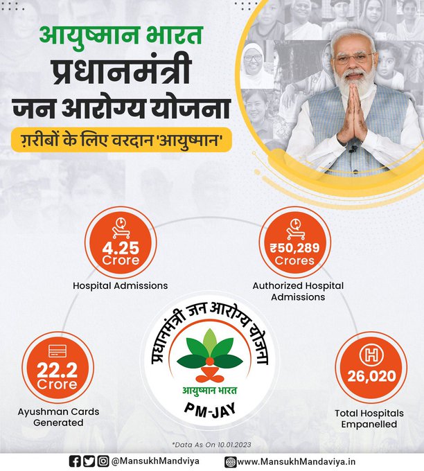 केन्द्रीय स्वास्थ्य मंत्री डॉ. मनसुख मांडविया ने गुरुवार को ट्वीट कर कहा कि पीएमजेएवाई योजना के तहत गरीबों को मुफ्त में चिकित्सकीय सुविधा उपलब्ध कराई जा रही है।