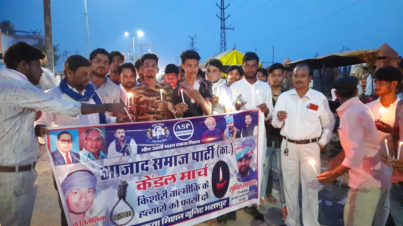 भीम आर्मी आजाद समाज पार्टी के कार्यकर्ताओं ने भरतपुर हीरादास से कुम्हेर गेट चौराहे तक निकाला कैंडल मार्च रिपोर्टर अजीत सिंह द्वारा बताया गया दिल्ली कैंट के नांगला गांव में 9 वर्षीय दलित लड़की का रेप करने के बाद उसकी हत्या व सबको जला दिया गया एवं आरोप है कि दिल्ली पुलिस आरोपियों को संरक्षण देने की कोशिश कर रही हैl