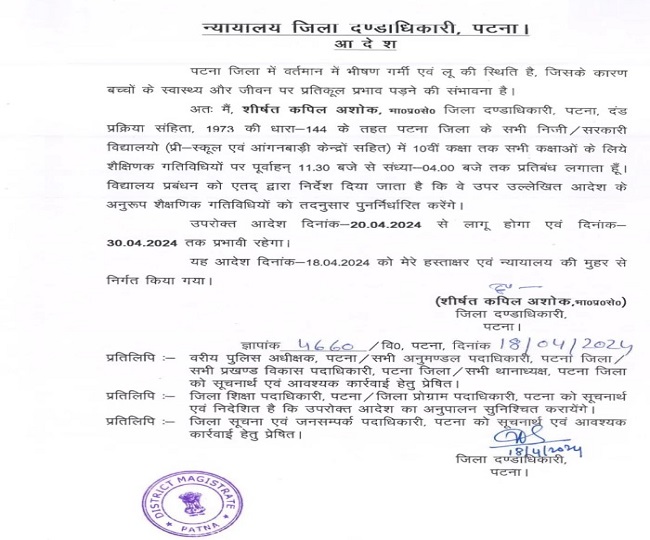 पटना- 19 अप्रैल। बिहार में बढ़ते तापमान और गर्म हवा को देखते हुए पटना जिला प्रशासन ने सरकारी और निजी स्कूलों के समय में बदलाव किया है। पटना के जिलाधिकारी शीर्षत कपिल अशोक ने जिले के सभी निजी और सरकारी विद्यालयों में 10वीं कक्षा तक की शैक्षणिक गतिविधियों को पूर्वाह्न 11:30 बजे से शाम 4:30 बजे तक प्रतिबंधित कर दिया है। यह आदेश 20 से 30 अप्रैल तक प्रभावी रहेगा।