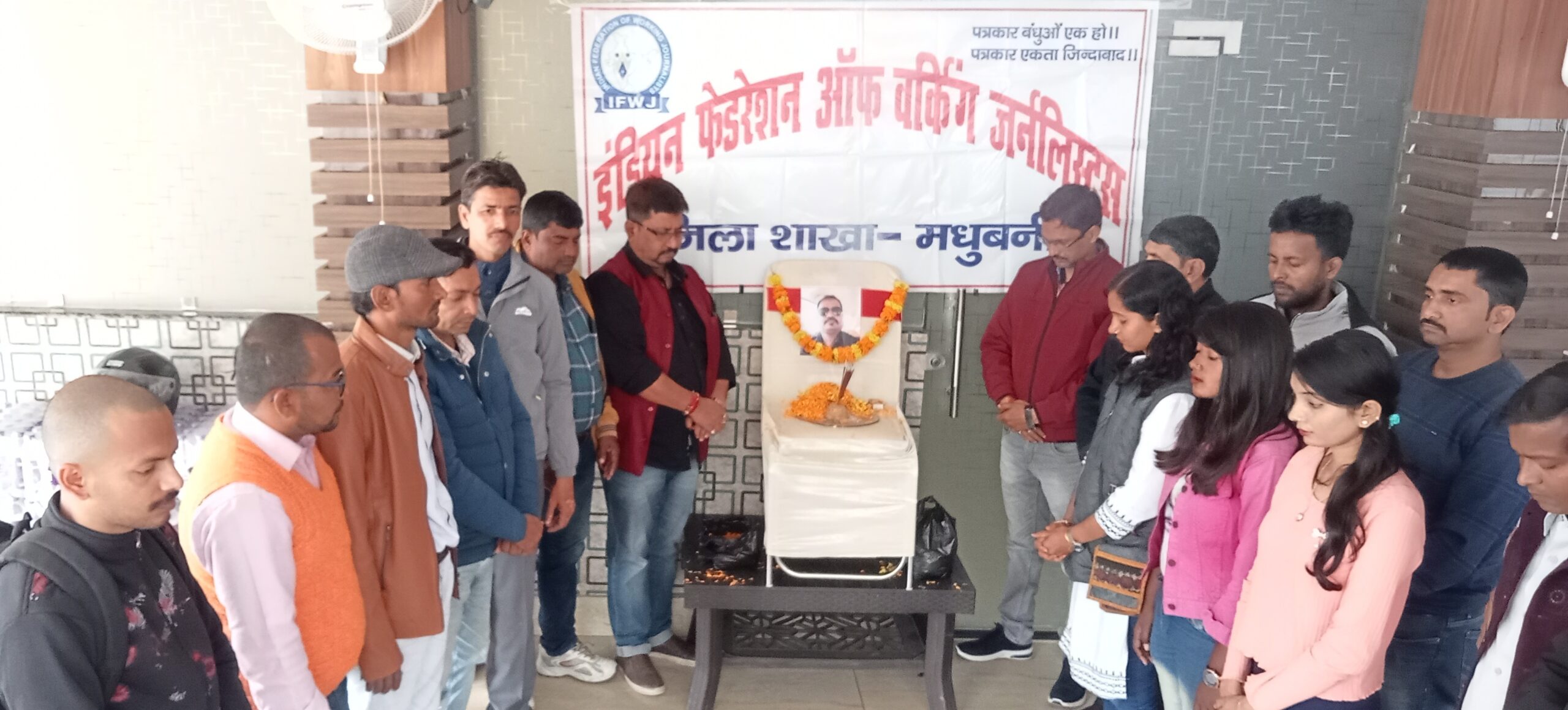 मधुबनी- 29 जनवरी। जिला मुख्यालय स्थित जलसा होटल के सभाहाॅल में इंडियन फेडरेशन आॅफ वर्किंग जर्नलिस्ट के तत्वधान में एक शोकसभा का आयोजन जिलाध्यक्ष हेमन्त कुमार सिंह में आयोजित हुई। जिसमें एक हिन्दी दैनिक अखबार के जयनगर के पत्रकार 45 वर्षीय सुनील कुमार को श्रद्धांजलि दी गई। तथा उनकी आत्मा की शांति के लिए दो मीनट का मौन रखते हुए उनके तैलचित्र पर पुष्प अर्पित किया गया।