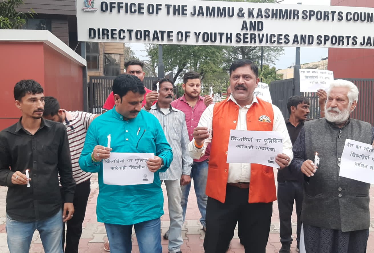 जम्मू- 04 मई। दिल्ली के जंतर मंतर पर अपनी मांगों को लेकर धरने पर बैठे राष्ट्रीय-अंतराष्ट्रीय पदक विजेता खिलाड़ी पहलवानों पर गत देर शाम पुलिसिया कार्रवाई के विरोध में गुरूवार को जम्मू में विभिन्न राजनीतिक और सामाजिक दलों ने संयुक्त रूप से कैंडल मार्च निकाला।