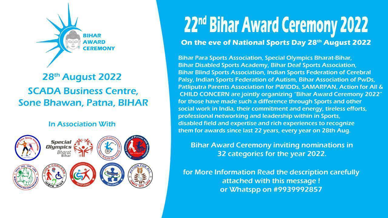पटना-19 जुलाई। बिहार पैरा स्पोर्ट्स एसोसिएशन, स्पेशल ओलंपिक भारत-बिहार,बिहार डिसेबल्ड स्पोर्ट्स एकेडमी, बिहार डेफ स्पोर्ट्स एसोसिएशन,बिहार ब्लाइंड स्पोर्ट्स एसोसिएशन, इंडियन स्पोर्ट्स फेडरेशन ऑफ सेरेब्रल पाल्सी, इंडियन स्पोर्ट्स फेडरेशन ऑफ ऑटिज्म,बिहार एसोसिएशन ऑफ पीडब्ल्यूडी, पाटलिपुत्र पेरेंट्स एसोसिएशन फॉर पीडब्ल्यूआईडीडी, समरपन, एक्शन फॉर ऑल एंड चाइल्ड कॉन्सर्न का आयोजन संयुक्त रूप से “बिहार अवार्ड सेरेमनी 2021” के लिए किया जा रहा है, जिन्होंने भारत में खेल और अन्य सामाजिक कार्यों, उनकी प्रतिबद्धता और ऊर्जा, अथक प्रयासों, पेशेवर नेटवर्किंग और खेल में नेतृत्व के माध्यम से ऐसा बदलाव किया है। विकलांग क्षेत्र और विशेषज्ञता और समृद्ध अनुभव उन्हें पुरस्कार के लिए पिछले 20 वर्षों से, हर साल 28 अगस्त को सम्मानित करती आ रही है।