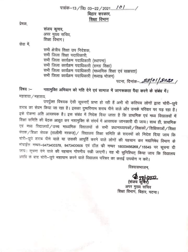 शिक्षा विभाग के अपर मुख्य सचिव संजय कुमार ने पूरे राज्य के सभी जिलों के शिक्षा पदाधिकारियों को पत्र जारी किया है। शिक्षा विभाग के अपर मुख्य सचिव ने पत्र में लिखा है कि ऐसी सूचनायें प्राप्त हो रही है कि अभी भी कतिपय लोगों द्वारा चोरी.-छुपे शराब का सेवन किया जा रहा है। इसे रोकना अति आवश्यक है। इस संबंध में निर्देश दिया जाता है कि प्राथमिक एवं मध्य विद्यालयों में शिक्षा समिति की बैठक आहूत कर नशामुक्ति के संदर्भ में आवश्यक जानकारी दी जाये।