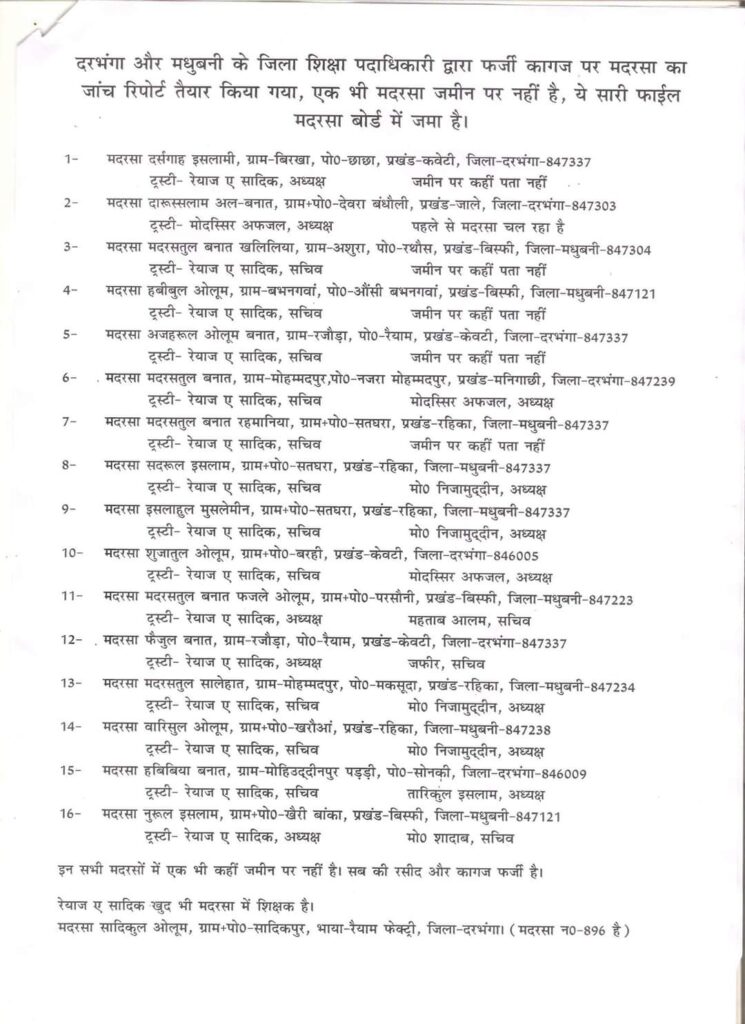 हाल ही में नयी बिहार सरकार वजूद में आयी और उक्त सरकार के शिक्षा मंत्री के साथ फोटो खचाकड़ सोशल मीडिया पर वायरल कर खुद को शिक्षा मंत्री से बहाली के संबंध में बातचीत होने की बात शिक्षित बेरोजगार युवाओं को बता रहा है। इस शातिर रेयाज-ए-सादिक का मधुबनी एवं दरभंगा में फर्जी मदरसा का बड़ा जाल बिछाए हुआ है। जिसमें जिला शिक्षा विभाग मधुबनी एवं जिला शिक्षा विभाग दरभंगा के अधिकारी एवं कर्मी संलिप्त हैं। अगर सरकार इस मामले को गंभीरता से लेते हुए जांच कराती है तो कई सफेदपोश अधिकारी एवं नेता बेनकाब होंगे।