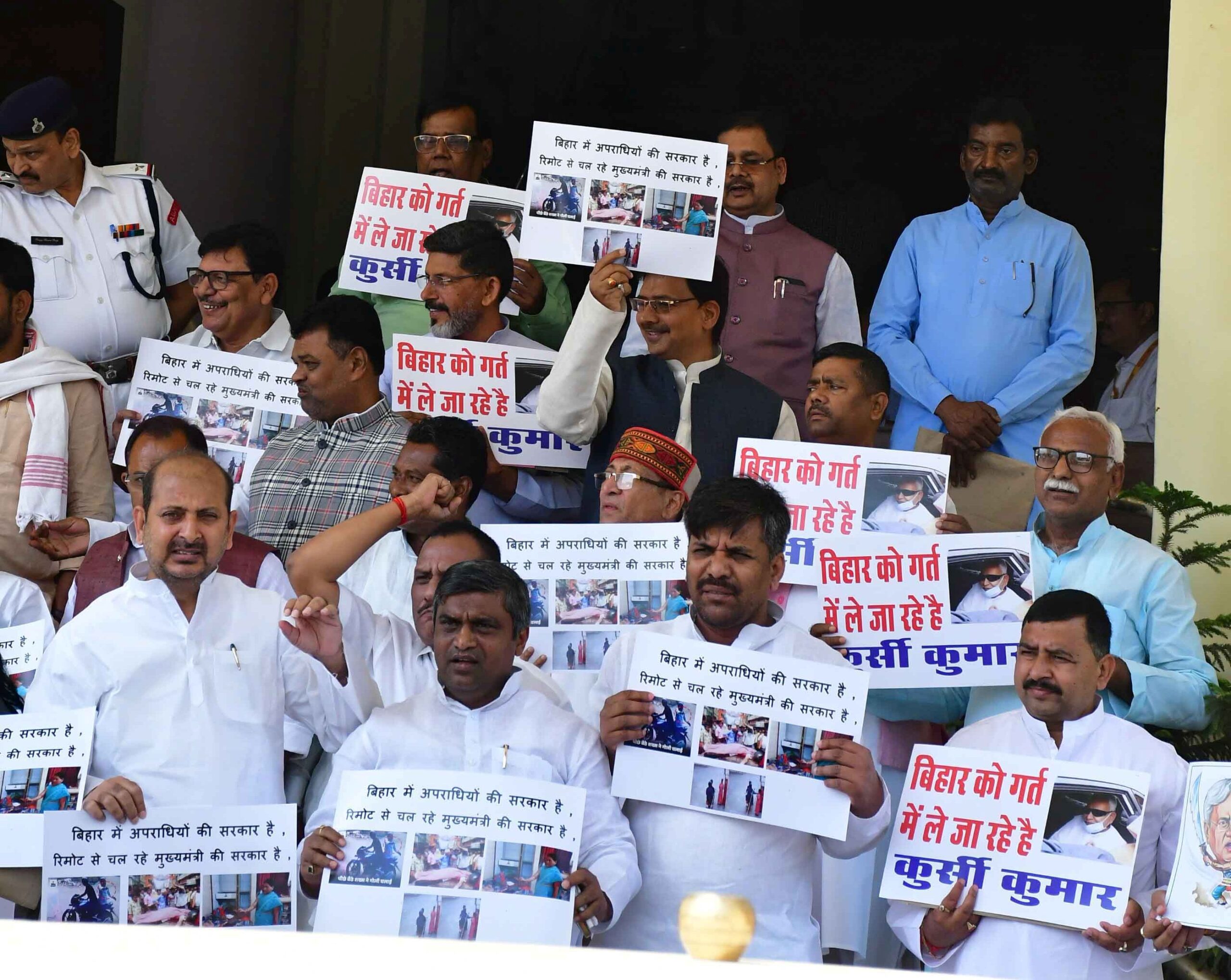 राजद विधायक मुकेश रौशन ने ‘बिहार में हर दिन हत्या, लूट, बलात्कार’ लिखे पोस्टर लहराए। राज्य के अलग अलग जिलों में पुलिसवालों की हत्या पर सदन के बाहर विधायकों ने बड़ा हंगामा किया। बाद में सदन के भीतर भी विरोध जारी रहा। सदन में विपक्ष ने खून की होली लिखे पोस्टर दिखाए। इसे लेकर स्पीकर ने मार्शल से कहा- छीन लो पोस्टर। मार्शल ने विपक्ष के विधायकों के हाथ से पोस्टर छीन लिए।