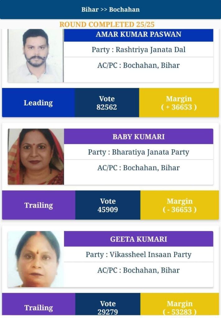 बोचहां में राजद की प्रचंड जीत, RJD के अमर पासवान ने BJP की बेबी को 36,653 मतों से हराया