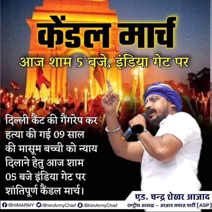 कैंडल मार्च का आयोजन शांतिपूर्ण तरीके से शाम 5:00 बजे इंडिया गेट पर किया जाएगा जिसकी अगुवाई चंद्रशेखर आजाद स्वयं करेंगे