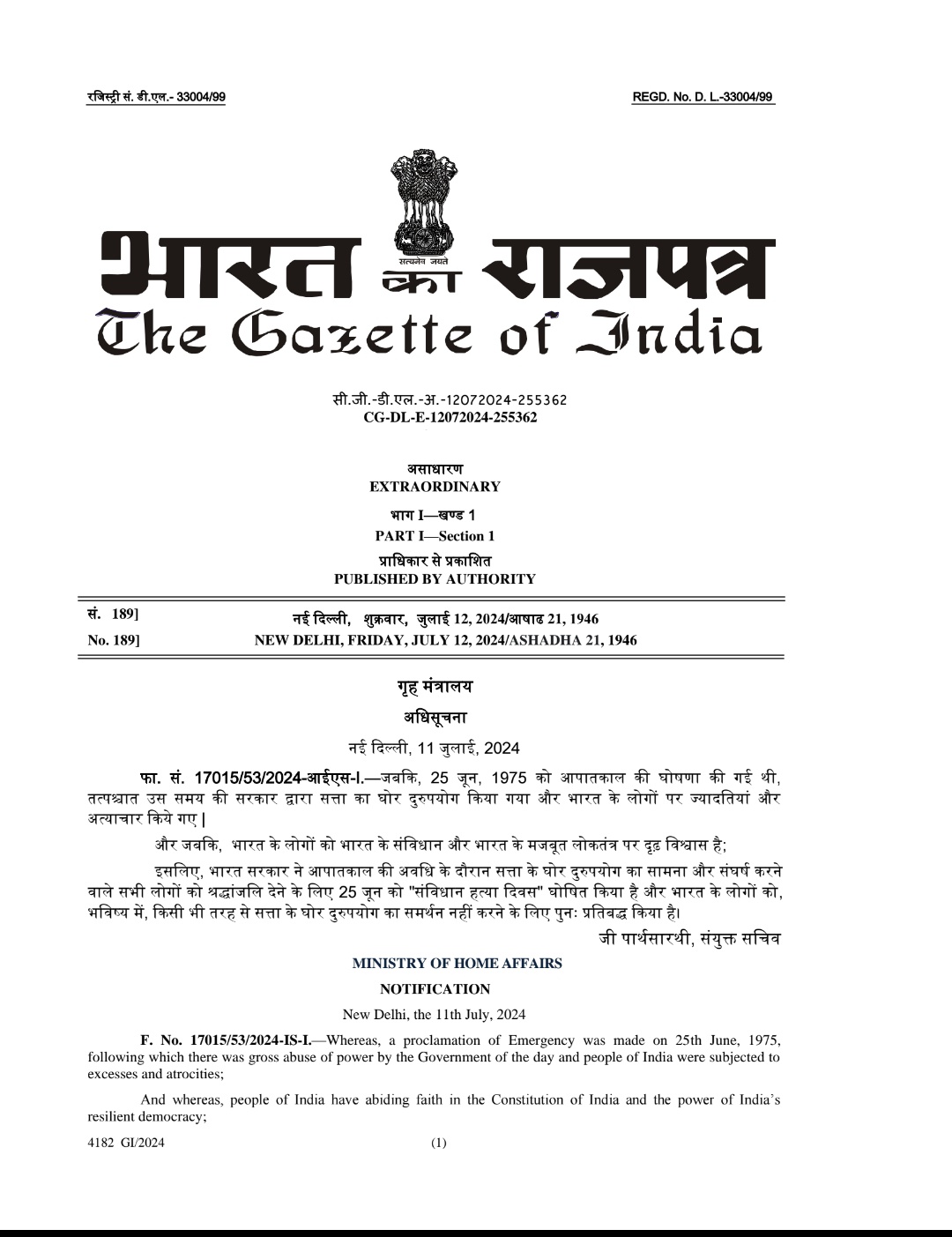 नई दिल्ली- 12 जुलाई। भारत सरकार अब से हर वर्ष 25 जून को ‘संविधान हत्या दिवस’ के रूप में मनाएगी। यह दिन उन सभी लोगों के विराट योगदान का स्मरण करायेगा, जिन्होंने 1975 के आपातकाल के अमानवीय दर्द को झेला था।
