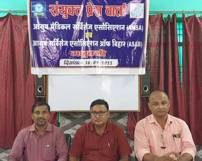 मधुबनी-16 सितंबर। जिला मुख्यालय स्थित एक होटल के सभागार में राज्य संघ (आसमा) एवं असाब के संयुक्त आह्वान पर जिला शाखा मधुबनी के दोनों संघ आयुष मेडिकल सर्विसेज एसोसिएशन एवं आयुष सर्विसेज एसोसिएशन ऑफ बिहार (असाब) की संयुक्त बैठक आयोजित हुई। बैठक में मुख्य मांगों पर एकमत होकर चर्चा की गई। बिहार सरकार द्वारा वर्ष 2020 में निकाली गई आयुष चिकित्सकों के लिए नियमित नियुक्ति में 6 माह पूर्व काउंसलिंग सहित सभी प्रक्रिया पूर्ण होने के बावजूद अनावश्यक विलंब होने के विरुद्ध,बिहार सरकार द्वारा लिए गए वर्ष 2018 में कैबिनेट निर्णय के बावजूद एमबीबीएस चिकित्सकों के बराबर मानदेय राशि का भुगतान नहीं किए जाने, आयुष चिकित्सकों को अपने पैथी की दवा के अनुपलब्धता के विरोध में, आयुष चिकित्सकों का मानदेय निर्धारित 44000 प्रतिमान नहीं भुगतान किए जाने एवं अनियमित भुगतान के विरोध में,राज्य के आह्वान पर उपरोक्त मांगों के समर्थन में मधुबनी जिला अंतर्गत कार्यरत सभी आयुष चिकित्सक चरणबद्ध आंदोलन में राज्य को सक्रिय सहयोग का संकल्प लिया गया। तथा आंदोलन की प्रतिबद्धता दोहराई गई। मौेके बताया गया कि 19 सितंबर को काला बिल्ला लगाकर कार्य करेंगे। 26 सितंबर को कलम बंद कार्य करेंगे, 8 अक्टूबर को सिविल सर्जन कार्यालय से जिला प्रतिरक्षण कार्यालय तक कैंडल मार्च निकाला जाएगा। तथा 14 अक्टूबर को गर्दनीबाग पटना में धरना प्रदर्शन एवं बिहार तकनीकी सेवा आयोग का घेराव व प्रदर्शन करेंगे।