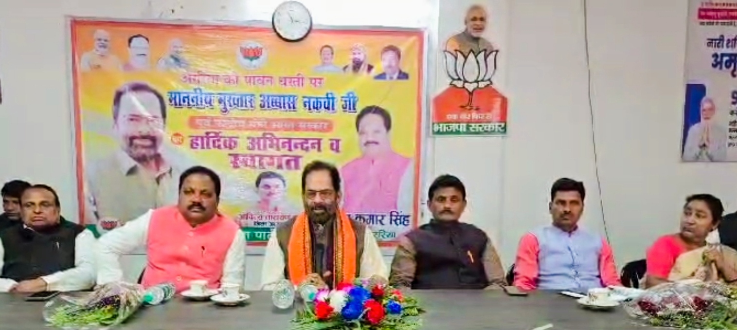 अररिया- 27 फरवरी। भाजपा लोकसभा कोर कमिटी और प्रबंधन समिति की बैठक में शामिल होने भारत सरकार के पूर्व केंद्र मंत्री मुख्तार अब्बास नकवी आज अररिया पहुंचे। भाजपा जिला कार्यालय में आयोजित इस महत्वपूर्ण बैठक में जिले के सभी प्रमुख भाजपा कार्यकर्ता के साथ लोकसभा कोर कमिटी और प्रबंधन समिति के सदस्य मौजूद थे, जिन्हें संबोधित करते हुए पूर्व केंद्र मंत्री ने कहा के इस बार के लोकसभा चुनाव में भाजपा इतिहास रचेगी। जिस तरह से प्रधानमंत्री नरेन्द्र मोदी ने समाज के हर वर्ग के लोगों के लिए कार्य किया है। उससे हर वर्ग के लोगों को लाभ मिल रहा है। इससे उनकी लोकप्रियता में काफी इजाफा हुआ है और पार्टी संगठन मजबूत हुआ है।
