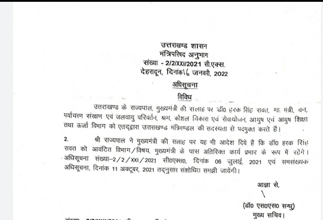 मुख्यमंत्री पुष्कर सिंह धामी ने राज्यपाल लेफ्टिनेंट जनरल गुरमीत सिंह को मंत्री,वन,पर्यावरण संरक्षण एवं जलवायु परिवर्तन,श्रम,कौशल विकास एवं सेवायोजन,आयुष एवं आयुष शिक्षा तथा ऊर्जा विभाग डॉ. हरक सिंह रावत को तत्काल प्रभाव से पदमुक्त करने का प्रस्ताव भेजा था। जिसे राज्यपाल ने अपनी स्वीकृत प्रदान करते हुए डॉ. हरक सिंह रावत को आवंटित विषय,विभाग अग्रिम आदेशों तक मुख्यमंत्री को अतिरिक्त प्रभार के रूप आवंटित करने का अधिसूचनावों को अनुमोदित कर आदेश दिए हैं। इसके तहत अधिसूचना संख्या-2/2/xx1/2021, 06 जुलाई 2021 एवं समसंख्यक अधिसूचना, 11 अक्टूबर, 2021 तदनुसार संशोधित समझी जाएगी।