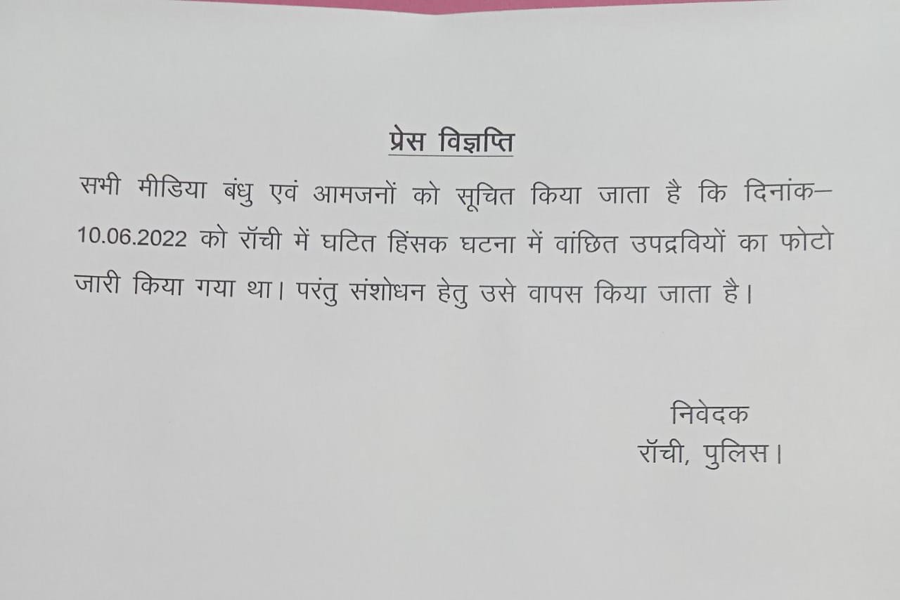 इस बाबत पूछने पर रांची के सिटी एसपी अंशुमन कुमार ने बताया की उन पोस्टर में कुछ करेक्शन किया जाना है। उसके बाद उन्हें दुबारा लगाया जाएगा। दरअसल, पोस्टर में जो फोटो लगाये गए थे उनमें से कुछ नाबालिग लग रहे थे। इस बात की सूचना जैसे ही पुलिस अधिकारियों को मिली उन्होंने पोस्टर हटाने का निर्देश दिया। बताया जाता है कि 10 जून को हुई हिंसा में एक 14 साल के किशोर की फायरिंग में मौत हो गयी गयी थी।
