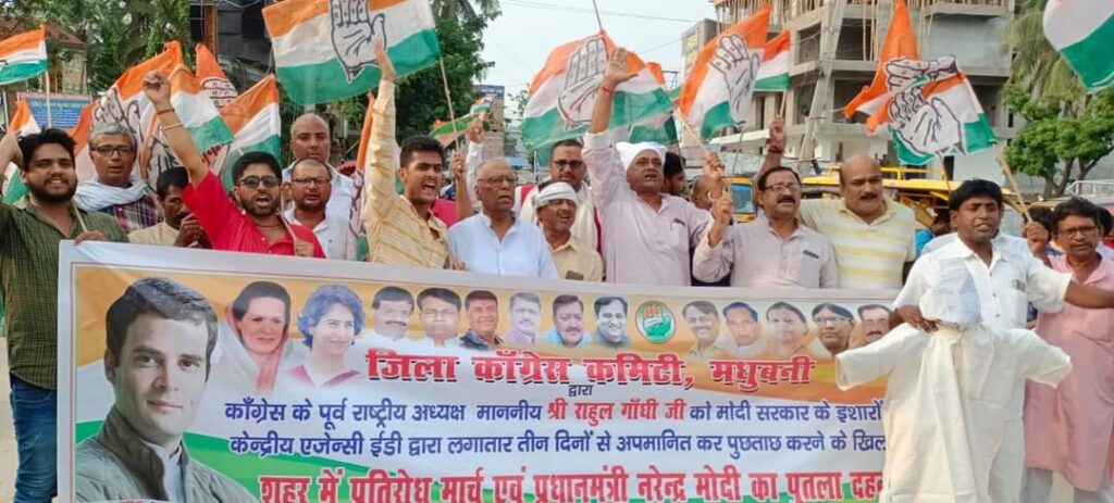 मधुबनी-15 जून। कांग्रेस कार्यकर्ताओं ने पार्टी के जिलाध्यक्ष प्रो. शीतलाम्बर झा के नेतृत्व में केन्द्र की मोदी सरकार के द्वारा लगातार केंद्रीय एजेंसियों का इस्तेमाल कर कांग्रेस पार्टी के पूर्व राष्ट्रीय अध्यक्ष राहुल गांधी एवं कांग्रेस अध्यक्षा सोनिया गांधी को अपमानित एवं प्रताड़ित करने के उद्देश्य से ईडी के द्वारा सम्मन कर तीन दिनों से पूछताछ कर रही है, जबकि देश के सबसे बड़ी अदालत सुप्रीम कोर्ट में यह मामला लंबित है। इस मामले में किसी भी तरह के जांच का आदेश नही है। उस परिस्थितियों में कांग्रेस पार्टी को बदनाम करने के लिए मोदी सरकार खड़यंत्र रच रही है। उसके खिलाफ कांग्रेस कार्यालय से प्रतिरोध मार्च निकालकर शहर के व्यस्तम थाना चोक पर प्रधानमंत्री का पुतला दहन किया।
