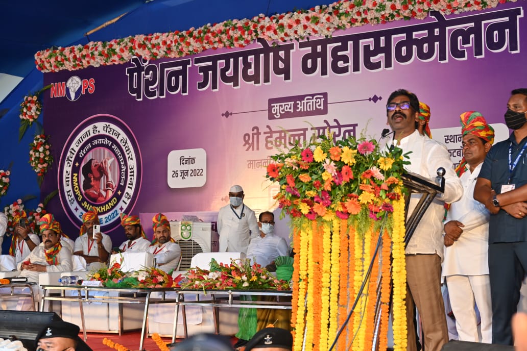 रांची- 26 जून। मुख्यमंत्री हेमन्त सोरेन ने कहा कि सरकार 15 अगस्त तक राज्य के विभिन्न सरकारी विभागों में कार्यरत सरकारी कर्मियों को पुरानी पेंशन स्कीम की सौगात देगी। 15 अगस्त तक सरकारी कर्मचारियों के लिए पुरानी पेंशन योजना लागू होगी। उन्होंने कहा कि सरकार सभी वर्गों के सामाजिक सुरक्षा के प्रति संवेदनशील है। मुख्यमंत्री ने रविवार को मोरहाबादी स्थित बिरसा फुटबॉल स्टेडियम में आयोजित पेंशन जयघोष महासम्मेलन में यह बातें कही।