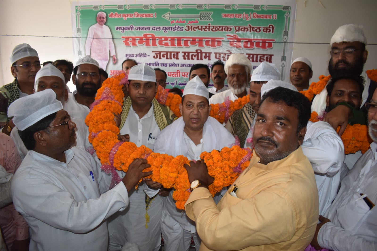 मधुबनी- 29 मई। जदयू अल्पसंख्यक प्रकोष्ठ की समीक्षात्मक एवं विस्तारित बैठक जिलाध्यक्ष सत्येंद्र कामत के अध्यक्षता में आयोजित हुई। बैठक में अल्पसंख्यक प्रकोष्ठ के प्रदेश अध्यक्ष सह विधान परिषद के पूर्व उपसभापति सलीम परवेज का निर्वतमान जिला अध्यक्ष अहमद हुसैन ने स्वागत टोपी एवं चादर पहनाकर किया।