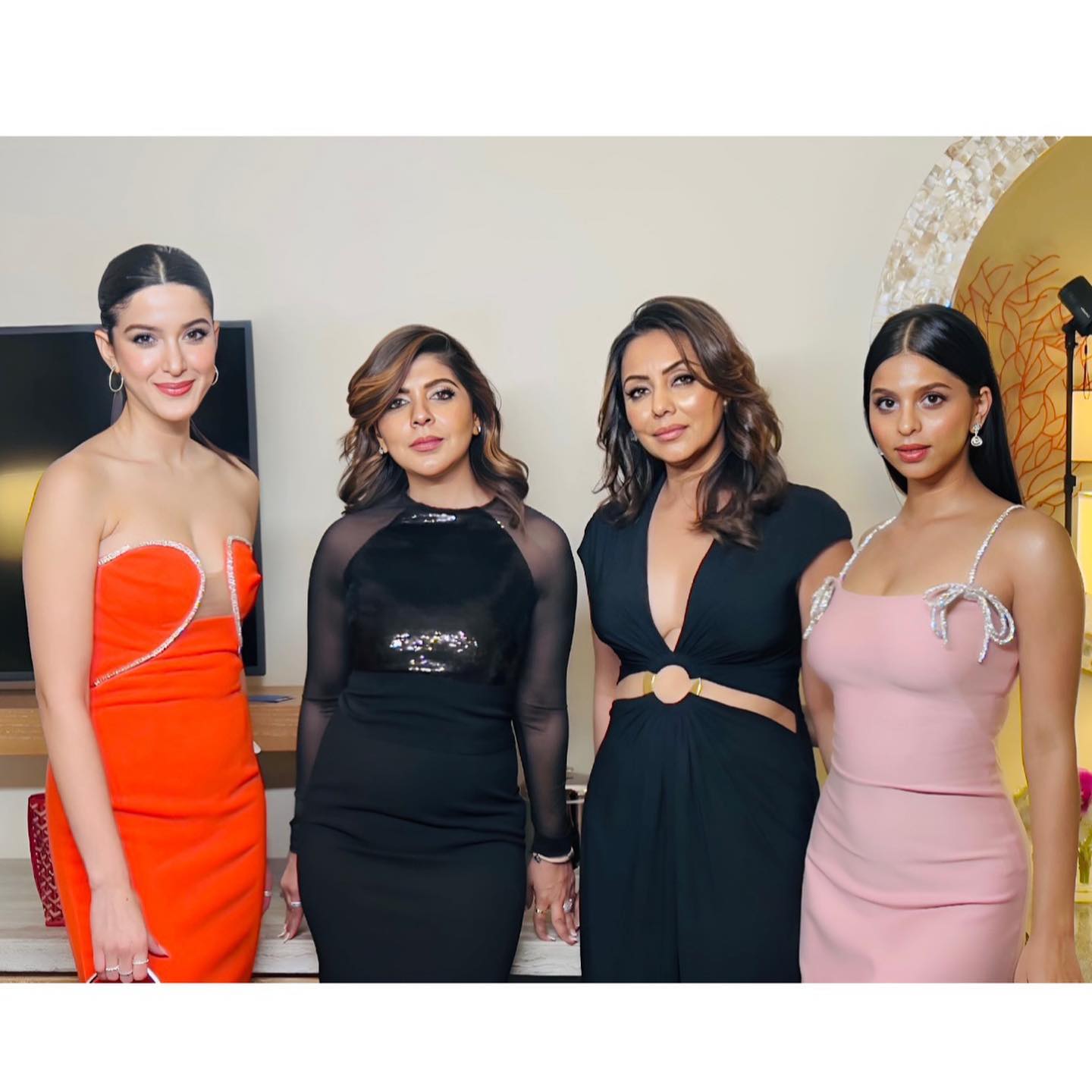 पहली तस्वीर में वह एक काले रंग के गाउन में और मैचिंग क्लच के साथ पोज देती हुई नजर आ रही हैं। ऐसा लगता है कि वह होटल लॉन्च के एक ब्लू कार्पेट इवेंट में शामिल हुईं थीं। उन्होंने अपने बालों को जूड़े से बांधा हुआ था और लुक को पूरा करने के लिए ड्रॉप ईयररिंग्स पहने। इसके बाद लॉन्च पार्टी से सुहाना, गौरी और शनाया कपूर की तस्वीर आई। जहां सुहाना अब गुलाबी रंग की ड्रेस में नजर आ रही हैं, वहीं शनाया लाल रंग की स्ट्रैपलेस ड्रेस में और गौरी ब्लैक गाउन में नजर आ रही हैं। तीसरी तस्वीर में सुहाना शॉर्ट पिंक ड्रेस में पोज दे रही हैं। यहां खुले हुए बालो में आराम से बैठकर आत्मविश्वास के साथ पोज देती दिखाई दे रही हैं।