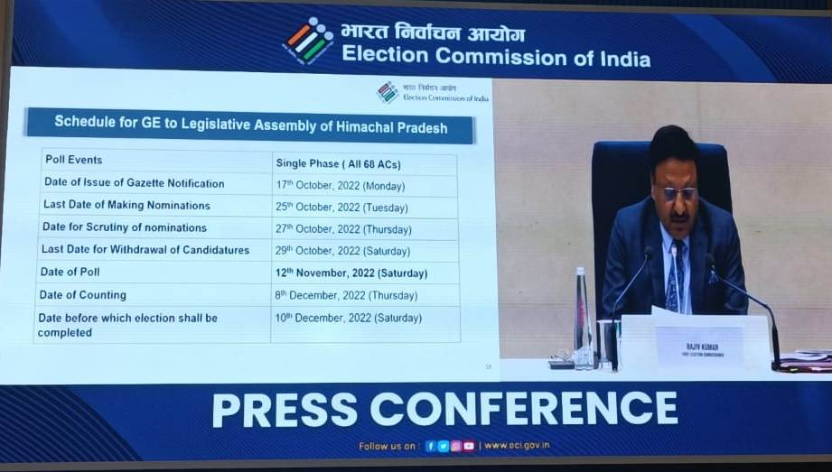नई दिल्ली- 14 अक्टूबर। चुनाव आयोग ने शुक्रवार को हिमाचल प्रदेश विधानसभा चुनाव कार्यक्रम की घोषणा कर दी। हिमाचल प्रदेश की सभी 68 सीटों पर एक चरण में चुनाव होगा। 12 नवंबर को वोटिंग होगी और आठ दिसंबर को नतीजे आएंगे। मुख्य चुनाव आयुक्त राजीव कुमार ने विधानसभा चुनाव कार्यक्रम की घोषणा यहां विज्ञान भवन में संवाददाता सम्मेलन में की। इस मौके पर चुनाव आयुक्त अनूप चंद्र पांडेय भी मौजूद रहे।