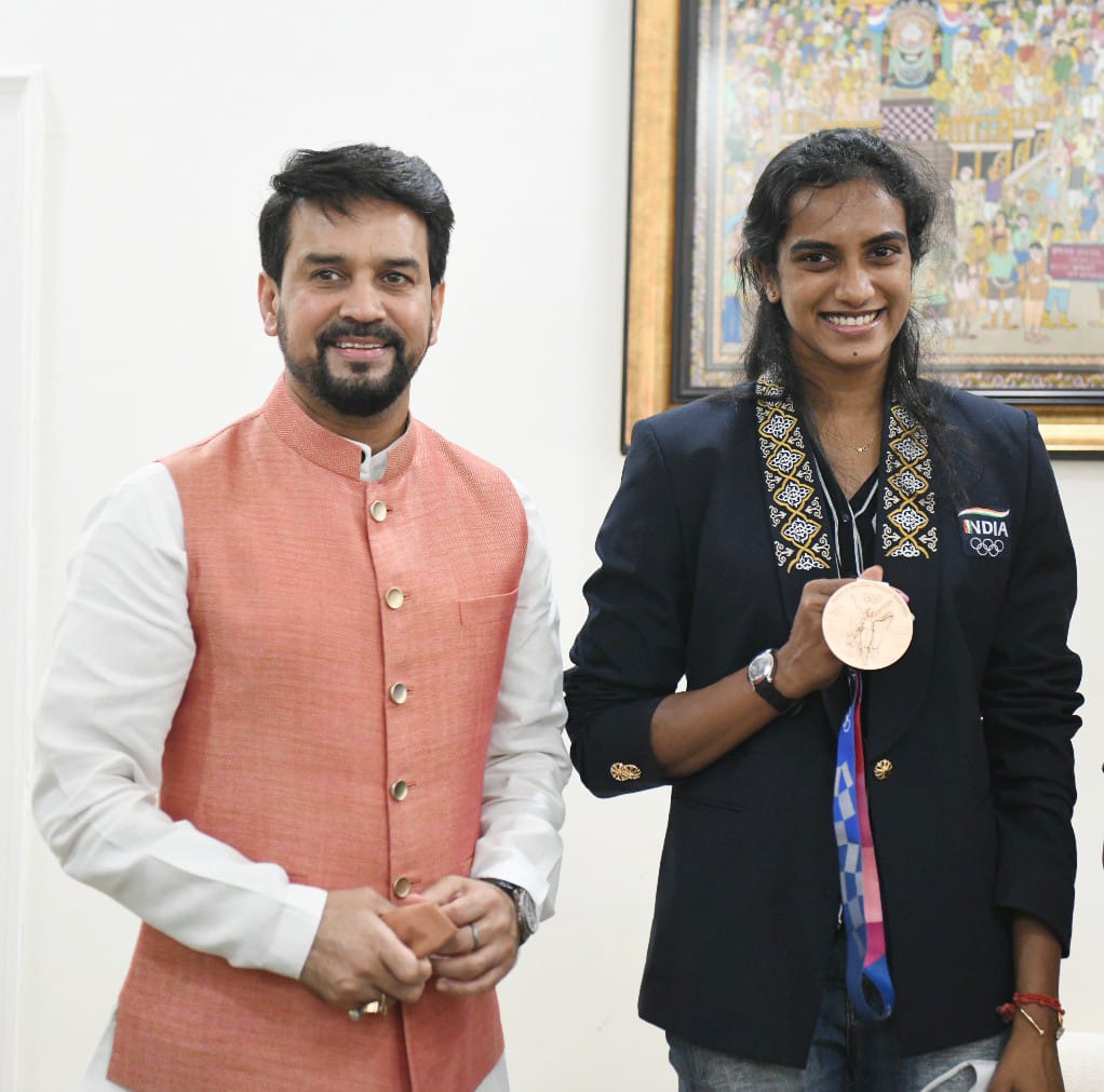 इस अवसर पर बोलते हुए, श्री ठाकुर ने कहा, “पीवी सिंधु भारत की महानतम ओलंपियनों में से एक हैं। वह एक प्रतीक हैं, भारत के लिए एक प्रेरणा हैं और उन सभी भारतीय खिलाड़ियों के लिए एक आदर्श जो देश के लिए खेलना चाहते हैं। लगातार दो ओलंपिक खेलों में दो ओलंपिक पदक जीतने की उनकी यह असाधारण उपलब्धि अगली पीढ़ी के खिलाड़ियों को प्रेरित करेगी। उनकी सफलता से पता चलता है कि कैसे सरकार की लक्ष्य ओलंपिक पोडियम योजना ने हमारे ओलंपिक के संभावित खिलाड़ियों को पोडियम फिनिश की ओर अग्रसर किया है। टोक्यो ओलंपिक खेलों के लिए रवाना होने से पहले प्रधानमंत्री श्री नरेन्द्र मोदी ने सिंधु से बात की थी। वह उनकी जीत के तुरंत बाद उन्हें बधाई देने वाले सबसे पहले व्यक्ति भी थे। 130 करोड़ भारतीय उनकी अद्भुत प्रदर्शन से रोमांचित हैं”।