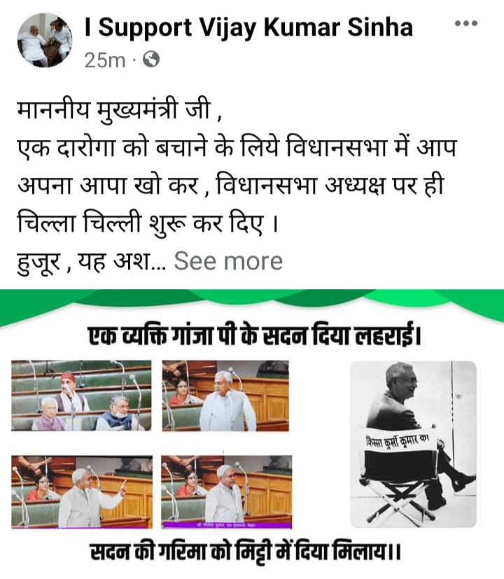 एक पोस्ट में कहा गया है कि मुख्यमंत्री जी, एक दारोगा को बचाने के लिये विधानसभा में आप अपना आपा खोकर विधानसभा अध्यक्ष पर ही चिल्ला चिल्ली शुरू कर दिए, हुजूर यह अशोभनीय था। समस्त भारत आपको अगला किसी संवैधानिक पद पर देख रहा है और आप एक दारोगा, डीएसपी को गोद में लिए घूम रहे हैं। जिस संविधान ने आपको तीसरे नंबर की पार्टी के विधानमंडल का नेता होने के बाद भी मुख्यमंत्री बनने का मौका दिया, वही संविधान लखीसराय के विधायक सह विधानसभा अध्यक्ष को भी कुछ शक्तियां दी है। बतौर गृहमंत्री आप सदन में किसी प्रश्न का जवाब नही देते हैं। बगल वाले कमरे में बैठ जाते हैं और वयोवृद्ध विजेंद्र बाबू को अपना जवाब बोलने के लिए लगा देते हैं। यह तो सन 1990 से लगातार प्रत्यक्ष रूप से निर्वाचित विजेंद्र बाबू जैसे वरिष्ठ राजनेता की भी तौहीनी है।