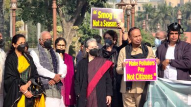 दिल्ली में खतरनाक प्रदूषण पर विपक्षी गठबंधन के सदस्यों का संसद परिसर में प्रदर्शन, सोनिया बोलीं- मुझे सांस लेने में दिक्कत