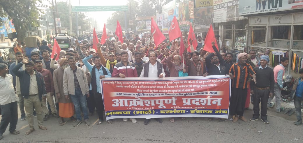 दरभंगा-15 दिसंबर। जिले के रजवाड़ाकांड में निर्दोष माले नेता पप्पू खा,अशोक पासवान को दोष मुक्त करने,कमतौल थाना के क्षेत्र में जगतनाथ राम के हत्या के न्याय के सवालों को उठाने पर ग्रामीणों पर लादे गये मुकदमे 148/22 एवं 150/22 में ग्रामीणों को राहत देने,माले नेता शिवन यादव पर जानलेवा हमला करने वाले आरोपियों की गिरफ़तारी करने,कमतौल थाना कांड संख्या 237/22 में बलात्कारियों को गिरफ्तार करने सहित, महिला थाना कांड संख्या-66/22 में जमीन विवाद में झूठा मुकदमा वापस लेने,गरीबों पर बुलडोजर चलाने पर रोक लगाने सहित 17 सूत्री मांगपत्र पर पिछले 12 दिसम्बर 2022 से भीषण ठंड चल में रहे अनिश्चितकालीन धरना पर प्रशासन के निष्क्रियता के खिलाफ भाकपा (माले ) एवं इंसाफ मंच के बैनर तले आक्रोशपूर्ण प्रदर्शन किया गया। प्रदर्शन भाकपा (माले) के राज्य कमिटी सदस्य अभिषेक कुमार,इंसाफ मंच के प्रदेश उपाध्यक्ष नेयाज अहमद,पप्पू पासवान,इंसाफ मंच के जिलाध्यक्ष अकबर रजा,धर्मेश यादव,ललन पासवान, शिवन यादव,देवेंद्र कुमार आदि के नेतृत्व में लहेरियासराय पोलो मैदान से सैकड़ो की संख्या में जुलुस निकला जो लहेरीसराय टावर,लहेरियासराय थाना होते हुये वरीय पुलिस अधीक्षक के मुख्य गेट को जामकर जमकर नारेबाजी किया। घंटो जाम रहने के बाद सदर एसडीपीओ ने आकर वार्ता किया। तथा उनसे सकारात्मक वार्ता हुई और उन्होंने कल वरीय पुलिस अधीक्षक से वार्ता कराकर सभी मामले को हल कराने का आश्वासन दिया। उसके बाद आंदोलन को स्थगित किया। मुख्य गेट पर धर्मेश यादव की अध्यक्षता में आयोजित सभा को सम्बोधित करते हुये अभिषेक कुमार और नेयाज अहमद ने कहा कि दरभंगा पुलिस को अपनी कार्य शैली को बदलना होगा और पब्लिक फरेंडली होना होगा। तथा भीषण ठण्ड में पीड़ित परिवार इंसाफ के लिए एसएसपी से चार दिन से गुहार लगा रहे थे, परंतु कोई सुनने वाला नहीं हैं। इसके खिलाफ जनता की गोलबंदी करना होगा। सभा को लक्ष्मण पासवान,अनुपम कुमारी,बसंत साह,शिवान यादव,चन्दन शर्मा,अली मोहम्मद आदि ने सम्बोधित किया।