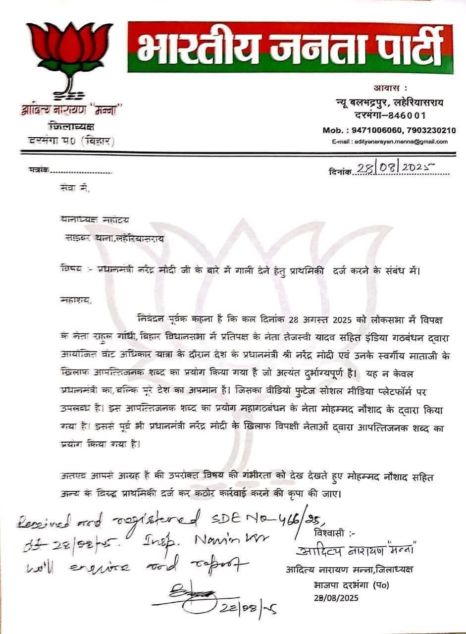 दरभंगा- 29 अगस्त। भाजपा जिला अध्यक्ष आदित्य नारायण मन्ना ने साइबर थाना लहेरियासराय में एक लिखित आवेदन देकर कांग्रेस नेता मो. नौशाद के खिलाफ प्राथमिकी दर्ज करायी है। जिसमें उन्होंने कहा कि दिनांक 28 अगस्त 2025 को लोकसभा में विपक्ष के नेता राहुल गांधी, बिहार विधानसभा में प्रतिपक्ष के नेता तेजस्वी यादव सहित इंडिया गठबंधन द्वारा आयोजित वोट अधिकार यात्रा के दौरान देश के प्रधानमंत्री नरेंद्र मोदी एवं उनके स्वर्गीय माताजी के खिलाफ आपत्तिजनक शब्द का प्रयोग किया गया है, जो अत्यंत दुर्भाग्यपूर्ण है। यह न केवल प्रधानमंत्री का, बल्कि पूरे देश का अपमान हैं। जिसका वीडियो फुटेज सोशल मीडिया प्लेटफॉर्म पर उपलब्ध है। इस आपत्तिजनक शब्द का प्रयोग महागठबंधन के नेता मोहम्मद नौशाद के द्वारा किया गया है। इससे पूर्व भी प्रधानमंत्री नरेंद्र मोदी के खिलाफ विपक्षी नेताओं द्वारा आपत्तिजनक शब्द का प्रयोग किया गया है। अतएव आपसे आग्रह है की उपरोक्त विषय की गंभीरता को देख देखते हुए मोहम्मद नौशाद सहित अन्य के विरुद्ध प्राथमिकी दर्ज कर कठोर कार्रवाई करने की कृपा की जाए। साइबर थानाध्यक्ष ने प्राथमिकी दर्ज मामले की जांच शुरू कर दी है।