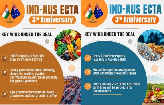 नई दिल्ली- 29 दिसंबर। भारत-ऑस्ट्रेलिया आर्थिक सहयोग और व्यापार समझौते (ईसीटीए) के तहत एक जनवरी से ऑस्ट्रेलियाई टैरिफ लाइनों पर 100 फीसदी ड्यूटी जीरो हो जाएगी, जिससे ऑस्ट्रेलिया को भारतीय निर्यात को बड़ा बढ़ावा मिलेगा। इस कदम से भारत के श्रम-गहन क्षेत्र के लिए नए मौके खुलेंगे, क्योंकि दोनों देशों ने द्विपक्षीय व्यापार समझौते की तीसरी सालगिरह मनाई है।