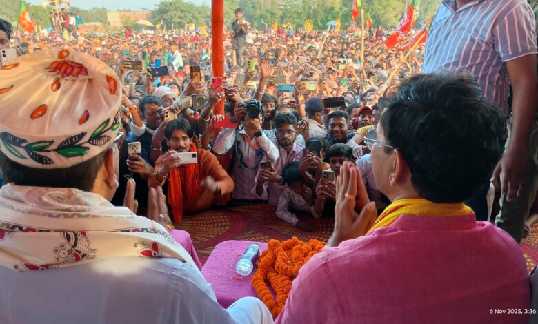 मधुबनी- 06 नवंबर। खजौली विधानसभा क्षेत्र के जयनगर के डीबी कॉलेज मैदान में एनडीए द्वारा चुनावी सभा का आयोजन किया गया। जदयू नेता मुख्य पार्षद कैलाश पासवान कि अध्यक्षता व भाजपा नेता अमरेश झा के संचालन में आयोजित सभा को संबोधित करते हुए भोजपुरी अभिनेत्रा पूर्व सांसद दिनेश लाल यादव निरहुआ ने कहा कि एक बार फिर खजौली विधानसभा क्षेत्र से एनडीए समर्थित भाजपा प्रत्याशी अरुण शंकर प्रसाद का निवेदन लेकर एक बार पुनः आपके पास आया हूं। मिथिलांचल की धरती से रहुआ ने भोजपुरी अंदाज में कहा आप सभी लोगों के निरहुआ रिक्शावाला के प्रणाम बा। उपस्थित भीड़ ने “जय श्रीराम” के नारों से स्वागत किया, जिस पर निरहुआ ने भी “जय श्रीराम, जय श्रीराम” दोहराया तो पूरा मैदान तालियों और सीटियों से गूंज उठा। उन्होने कहा कि जो राम का नहीं वो किसी काम का नहीं है। बिहार में एनडीए सरकार ने विकास की रफ्तार बढ़ाया है। भाजपा प्रत्याशी अरुण शंकर प्रसाद ने कहा कि हमने अपने कार्यकाल में खजौली विधानसभा क्षेत्र में चहुंमुखी विकास किया। जनता के बीच एक बार फिर आर्शिवाद मांगने आया हूं।