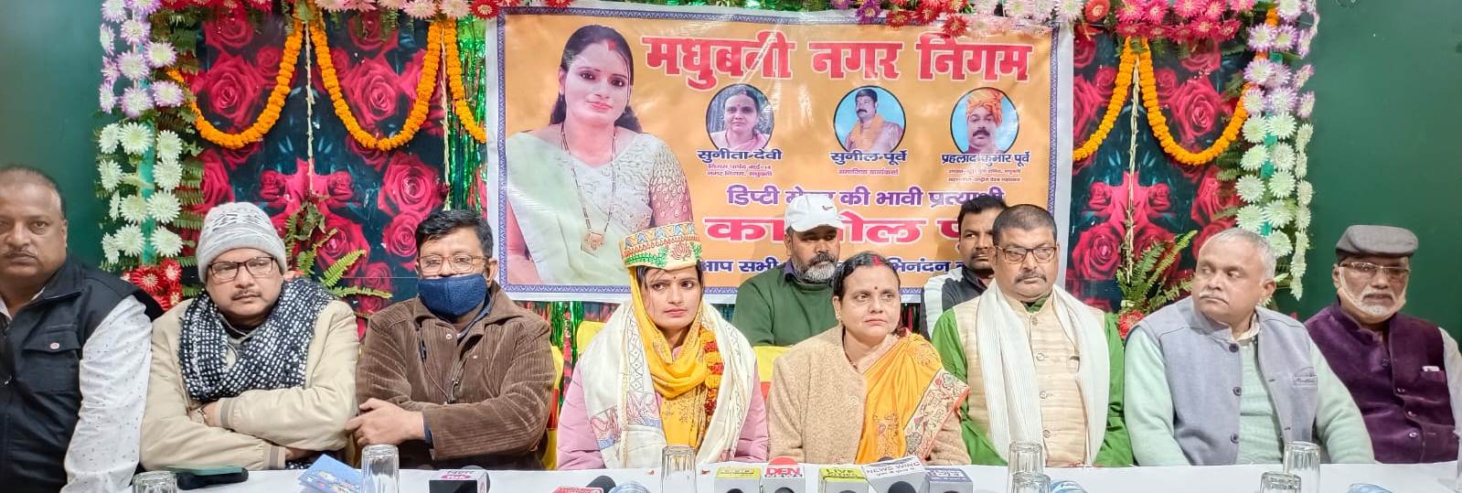 मधुबनी-21 जनवरी। शहर स्थित एक निजी होटल में शुक्रवार को नगर निगम डिप्टी मेयर की दावेदारी को लेकर प्रेस कांफ्रेस आयोजित हुआ। जिसमें निर्वतमान पार्षद सुनीता पूर्वे सहित कई लोगों ने डिप्टी मेयर की उम्मीदवार काजोल पूर्वे को घोषित किया गया। प्रेस कांफ्रेस को सम्बोधित करते हुए नगर निगम की निर्वतमान पार्षद सुनीता पूर्वे ने कहा कि हमारा परिवार 15 वर्षो से भी ज्यादा जनप्रतिनिधि बनकर सामाज की सेवा करते आ रहे हैं।