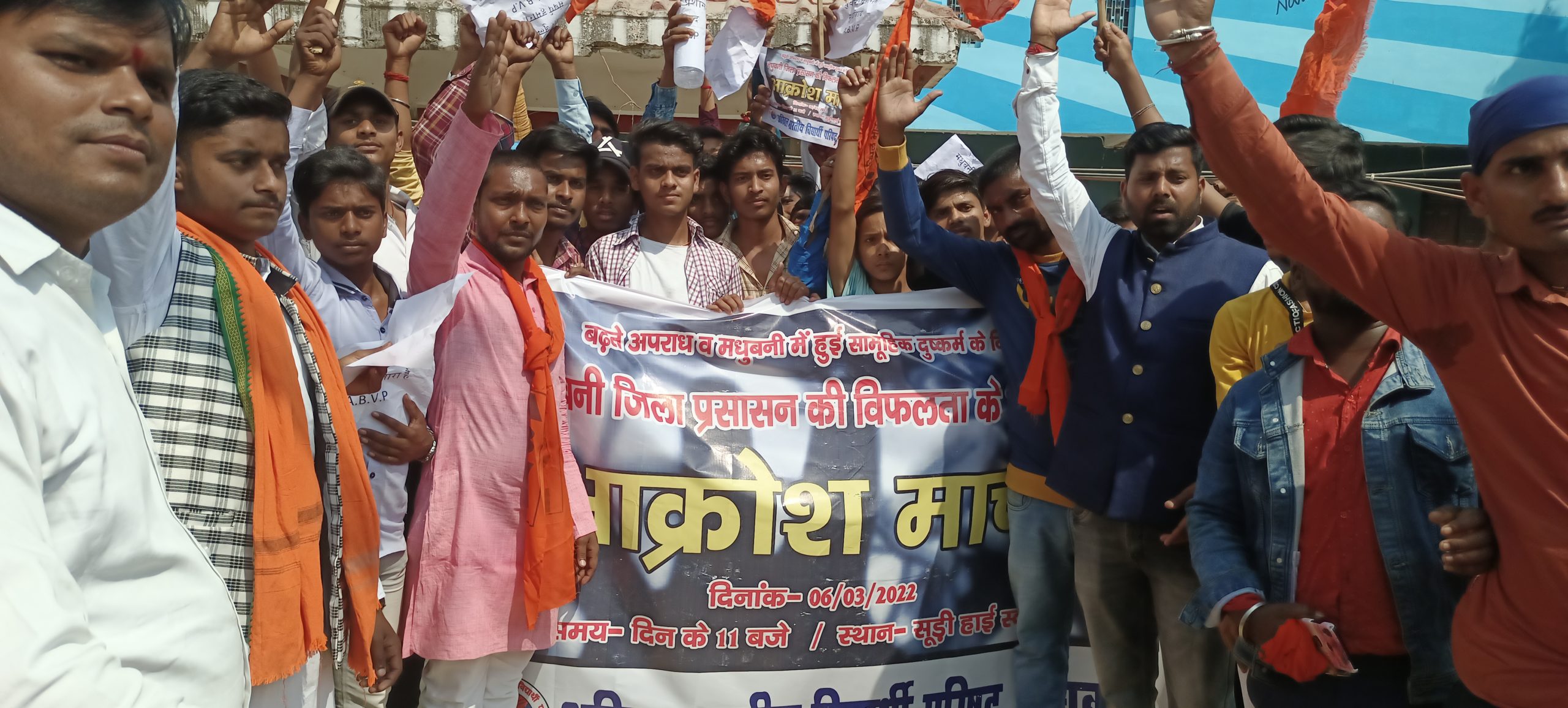 मधुबनी- 06 मार्च। अखिल भारतीय विद्यार्थी परिषद जिला इकाई मधुबनी के तत्वाधान में प्रांत कल्याण सह छात्रावास संयोजक मनीष पासवान एवं राजू इंजिनियर के नेतृत्व में जिला प्रशासन मधुबनी की विफलता के खिलाफ आक्रोश मार्च निकाला गया। मौके पर अभाविप मिथिला विश्वविद्यालय के संयोजक अशोक कुशवाहा ने कहा कि लगभग दो वर्षों से मधुबनी जैसे क्षेत्रों में लगातार हत्या लूट बलात्कार जैसे घटना का अंजाम दिया जा रहा है। तथा जिला पुलिस प्रशासन गहरी नींद में सोई हुई है।