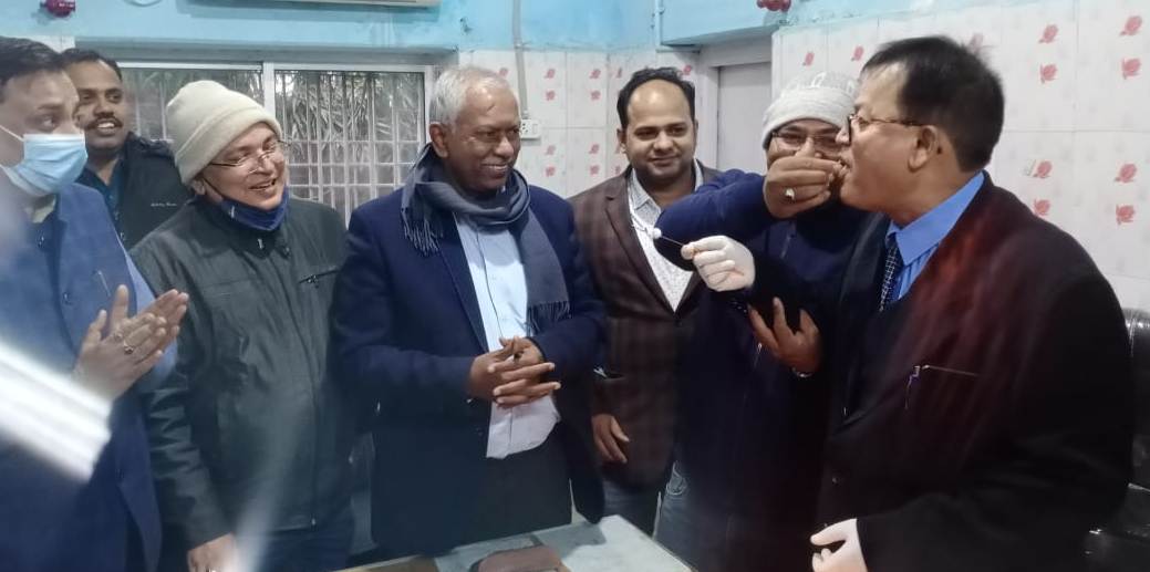 मधुबनी-01 जनवरी। सदर अस्पताल के अधीक्षक कार्यालय में शनिवार को केक काटकर नव वर्ष मनाया गया। इस दौरान सदर अस्पताल के प्रभारी अधीक्षक डा. डीएस मिश्र एवं एसीएमओ डा.आरके सिंह भी मौजूद रहे। मौके पर प्रभारी अधीक्षक डा. डीएस मिश्र ने बताया कि सदर अस्पताल उनके लिए घर जैसा है,व यहां कार्यरत चिकित्सक एवं स्वास्थ्यकर्मी उनके लिए परिवार जैसे हैं।