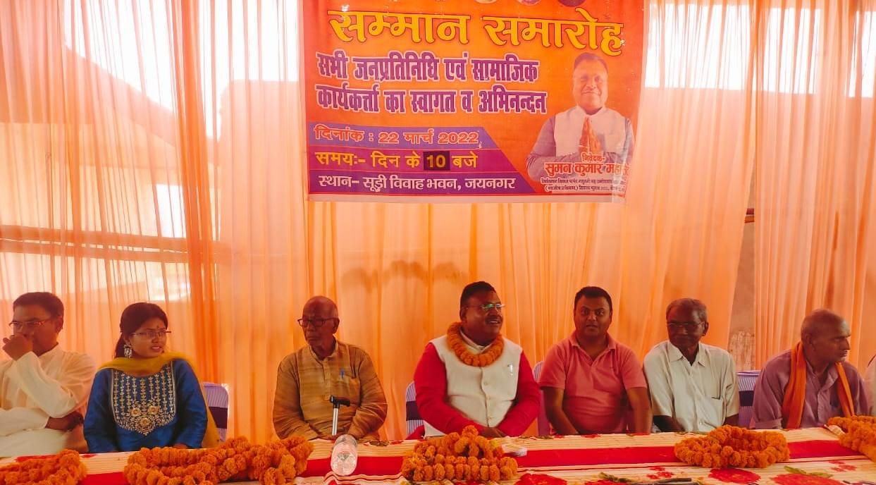 मधुबनी-22 मार्च। जयनगर के सूड़ी विवाह भवन में एमएलसी प्रत्याशी सुमन महासेठ के समर्थन में सम्मान समारोह का आयोजन हुआ। समारोह में सभी जनप्रतिनिधि एवं समाजिक कार्यकर्ताओं का स्वागत व अभिनंदन किया गया। बतादें कि भाजपा कोटे से मधुबनी एमएलसी रहे सुमन महासेठ इस वर्ष पार्टी के द्वारा टिकट काटने से निर्दलीय प्रत्याशी के रूप में चुनावी मैदान में हैं। सुमन महासेठ के सम्मान समारोह में भाजपा के कई नेता एवं कार्यकर्ता मंचासीन थे। मौके पर सुमन महासेठ ने कहा कि हमने एमएलसी रहते कई कार्य किए है। मैनें हमेषा निकाय एवं पंचायत प्रतिनिधियों को सम्मान देने का कार्य किया है। तथा आगे भी सम्मान देने का काम करेंगे।